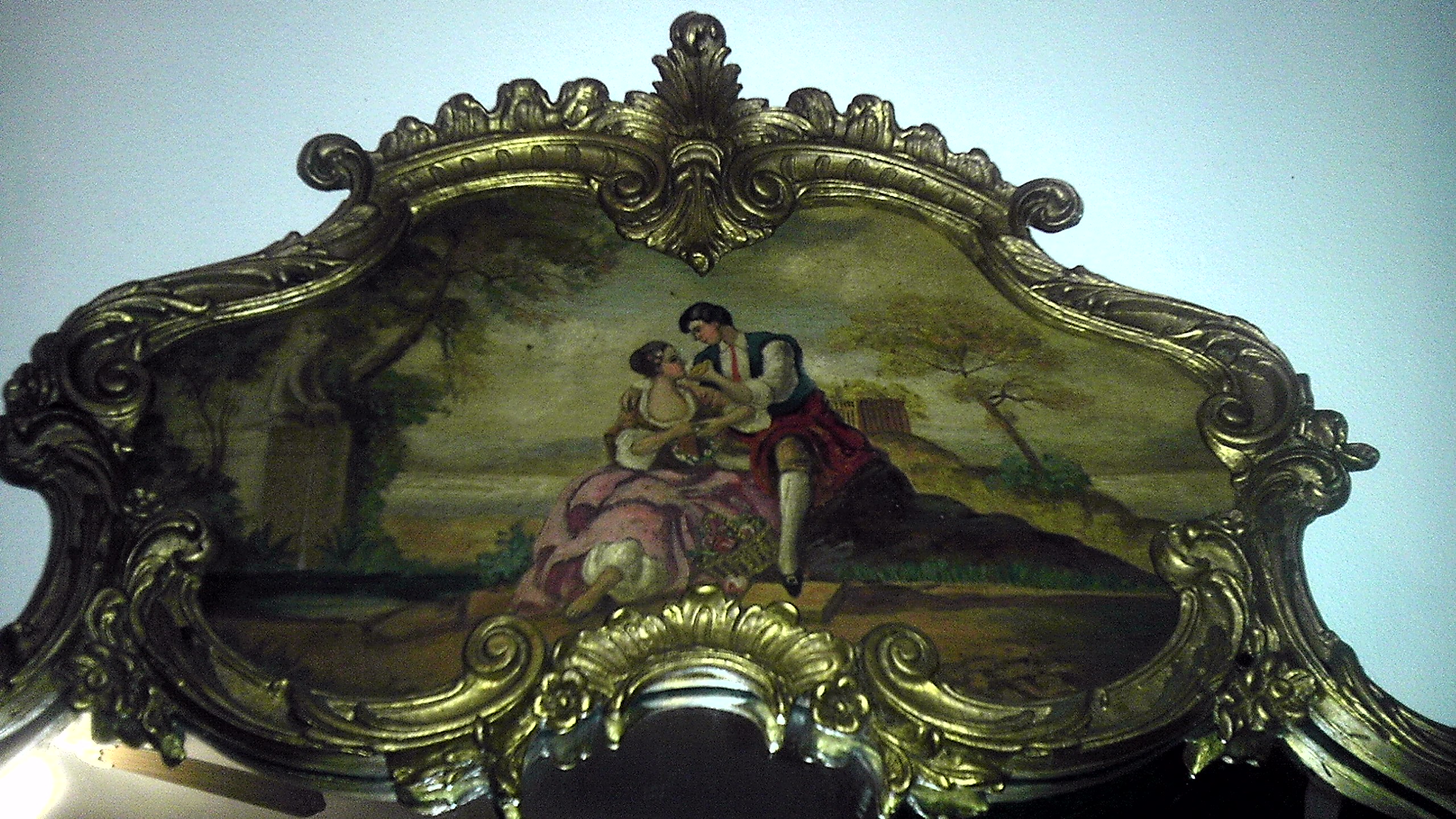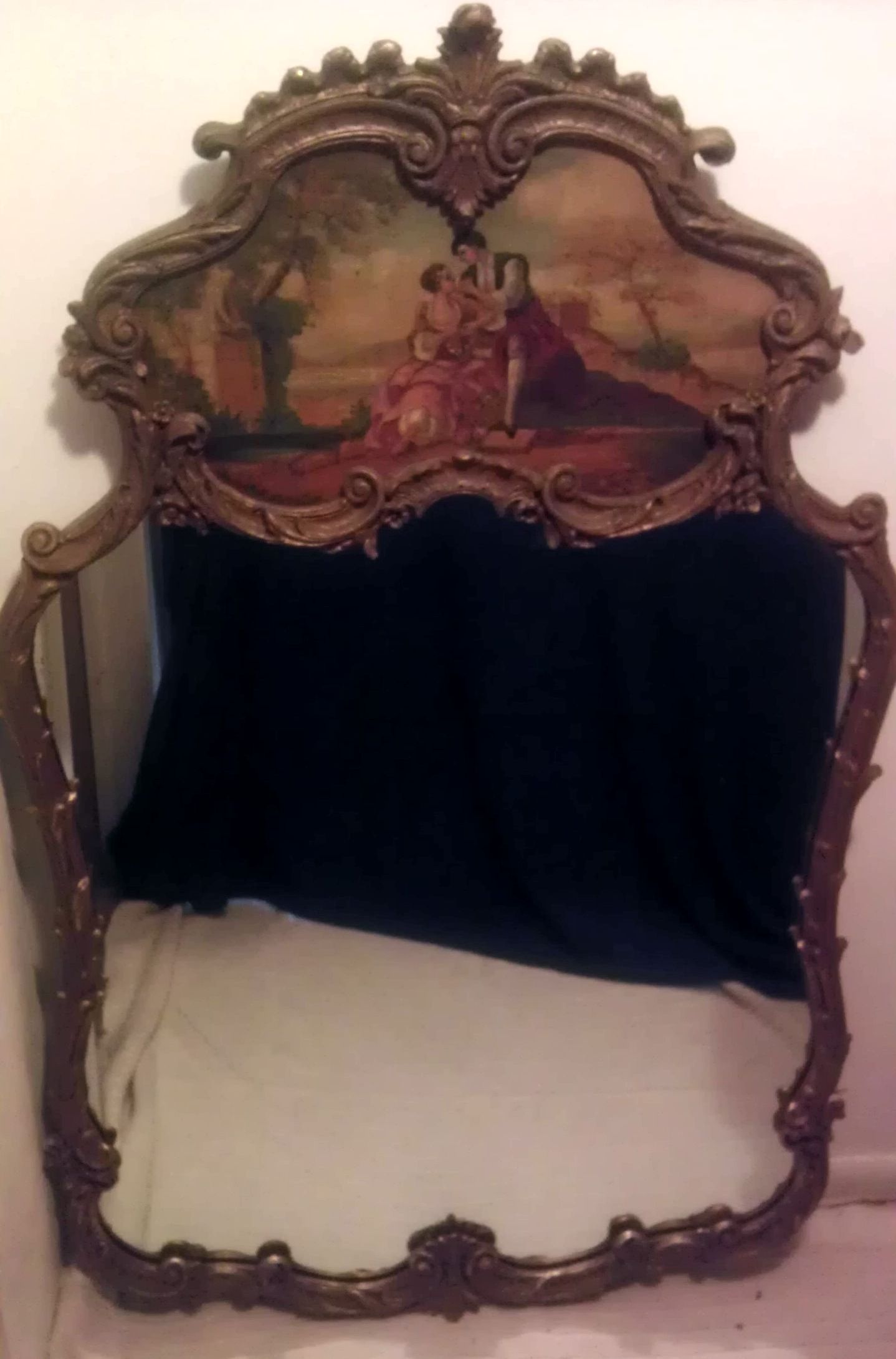 I inherited this old mirror, and don't know much about it. I have seen some similar mirrors online, and now believe that it may be a French Trumeau mirror. I haven't seen any quite like it though, and I'm wondering what it really is and what it may be valued at. It is in good condition for it's age. The wood frame has been chipped in 2 places, one on each side. The oil painting itself is in great condition. Thanks for any information you can provide.