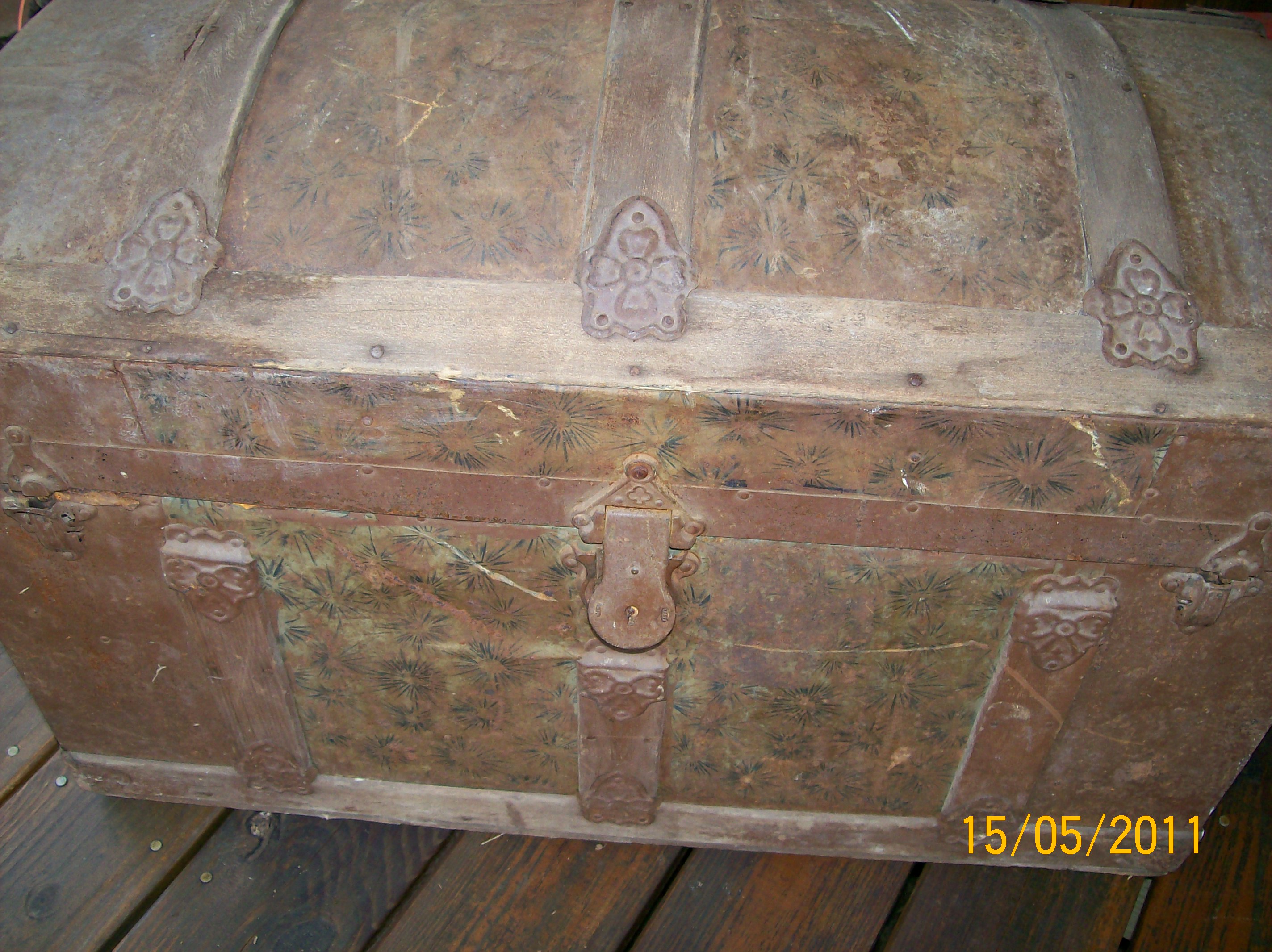 Trunk has a curved top. It is made of some type of metal with wood trim. Has small wheels on bottom. There is a tray with trunk. One of the latches and side handle are missing. It does need to be restored. I could not find a date or name on trunk.