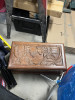 We bought this trunk because of the beautiful carved wood scenes on all sides. There is a large dragon on the top with bats in each corner, smaller dragons on each side and birds on the front. The seller had very little history about the piece. It is darkly stained wood with (brass?) metal accents. I have no idea if it is antique or modern, but I have been able to find very little information about it to date and haven't seen anything else like it yet. Does anyone have any information about this or similar pieces?
