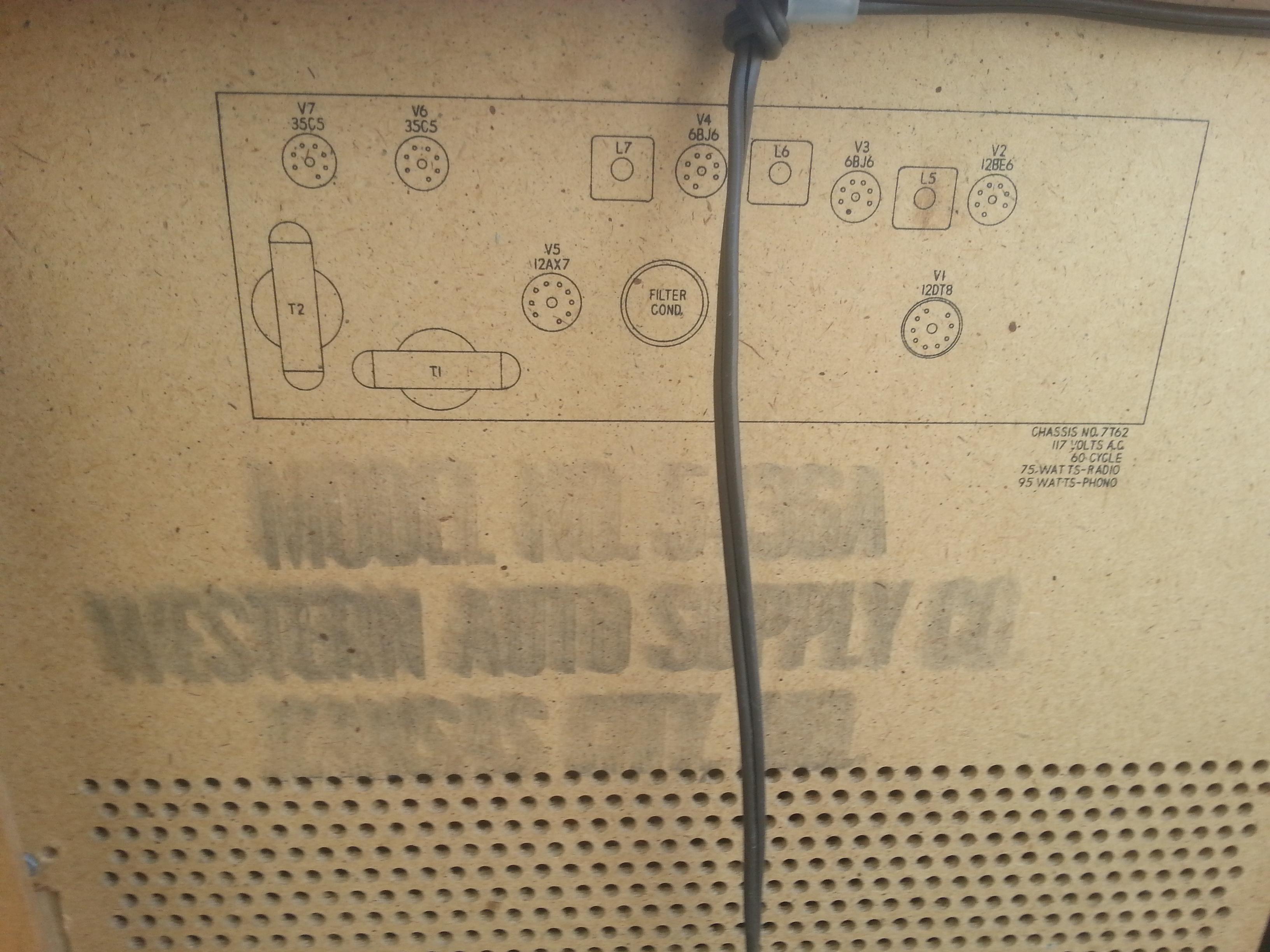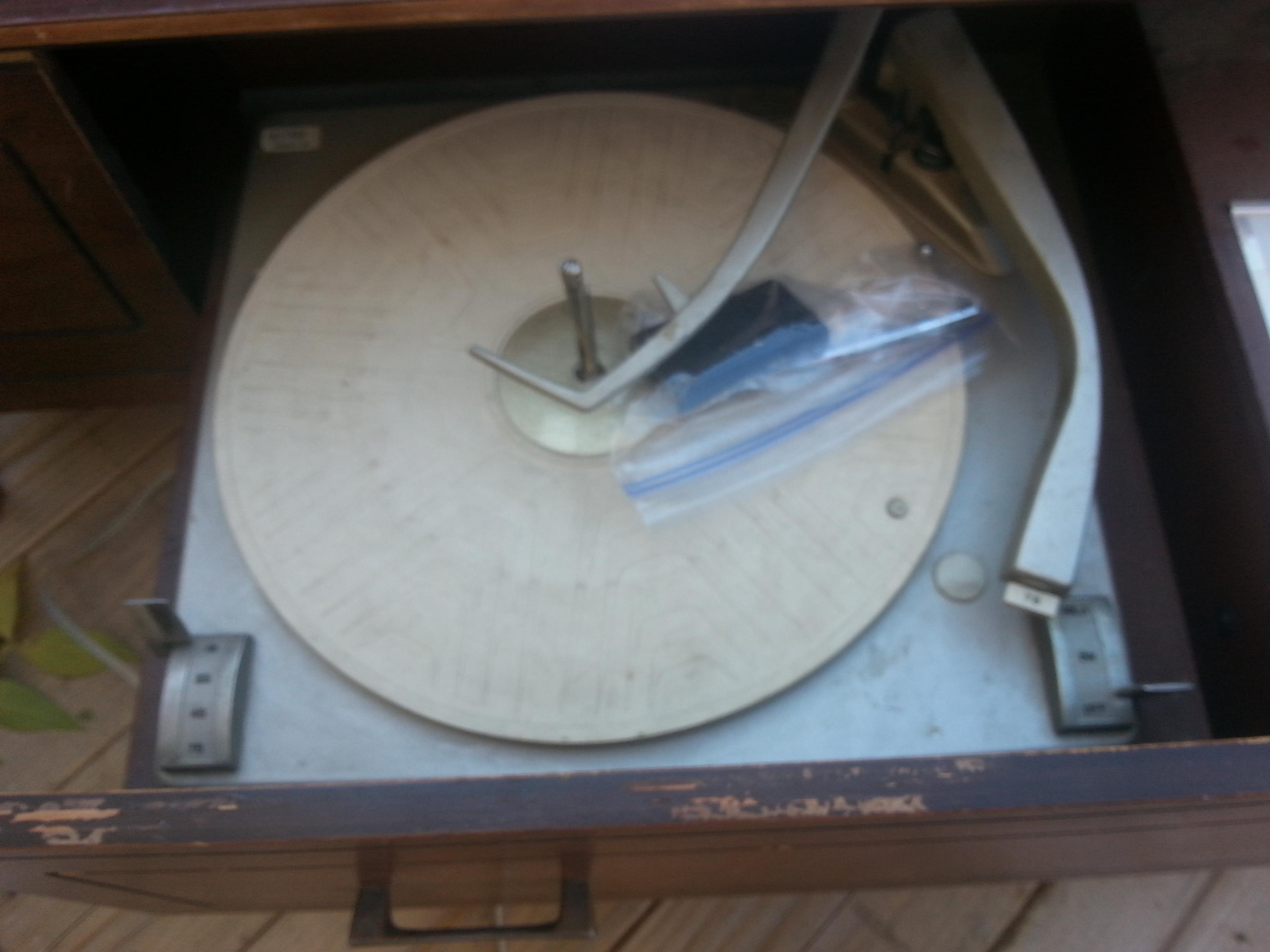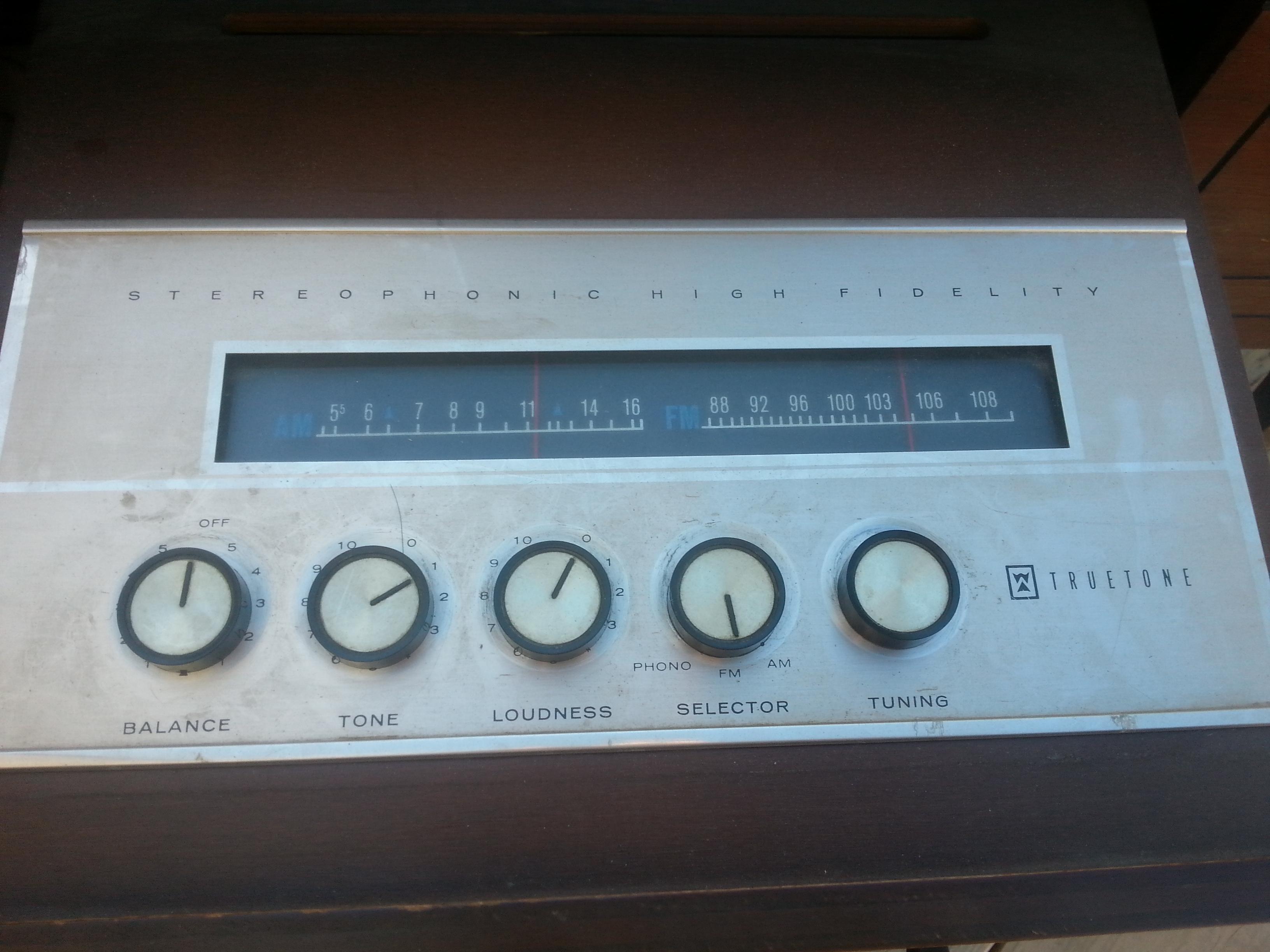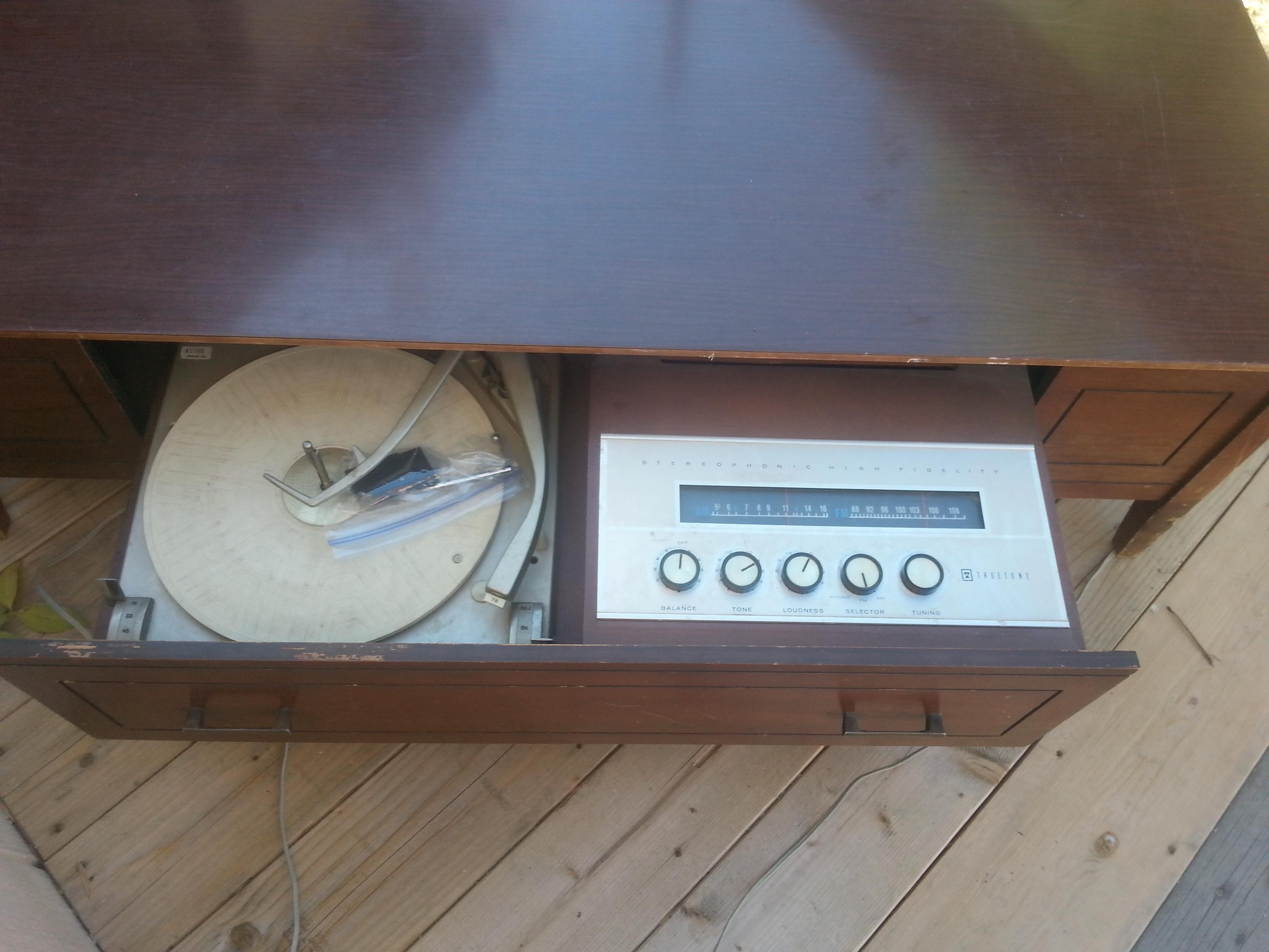 Coffee table radio/ record player ...trutone stereophonic high fidelity...serial no. A61868...model no 5-35 or 36a ????....western auto supply co, kansas city mo...radio works...record player does not...has nicks and scratches...wear and tear