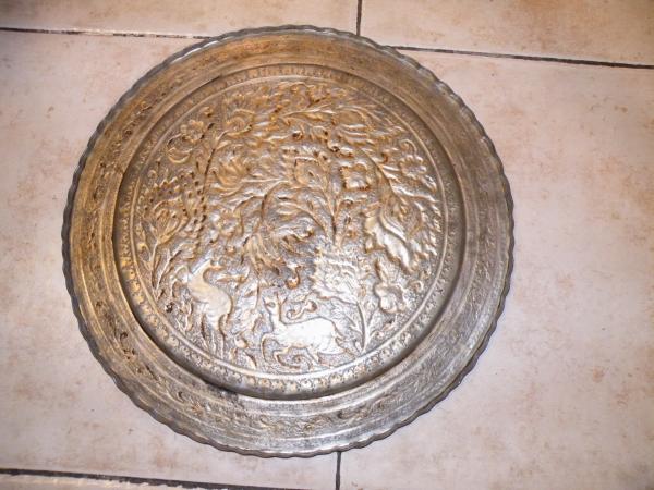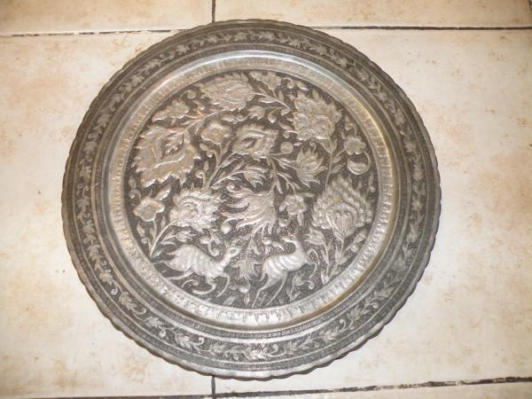 This is a very detailed designed platter/tray. It shows 2 deer surrounded by a floral design. There is intricate scroll work and patternwork throughout.