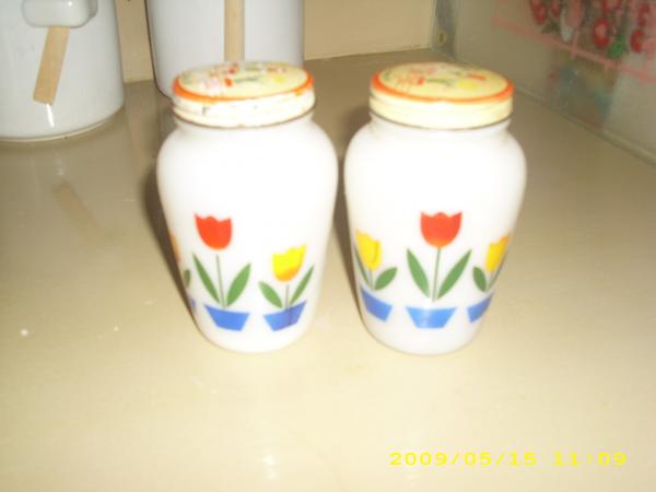 White glass with red and yellow tulips all around outside same tulips on the lids