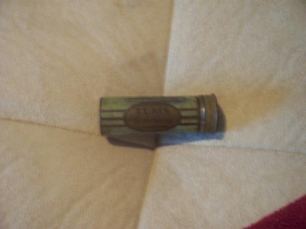 It has minimal rust. It looks pretty worn but works wonderfully. The bottom pushes up to despense tums, no sticking and no rust on the inside. The lid comes off and on easily. All the words but one are ledgable. There are no dates on it.
