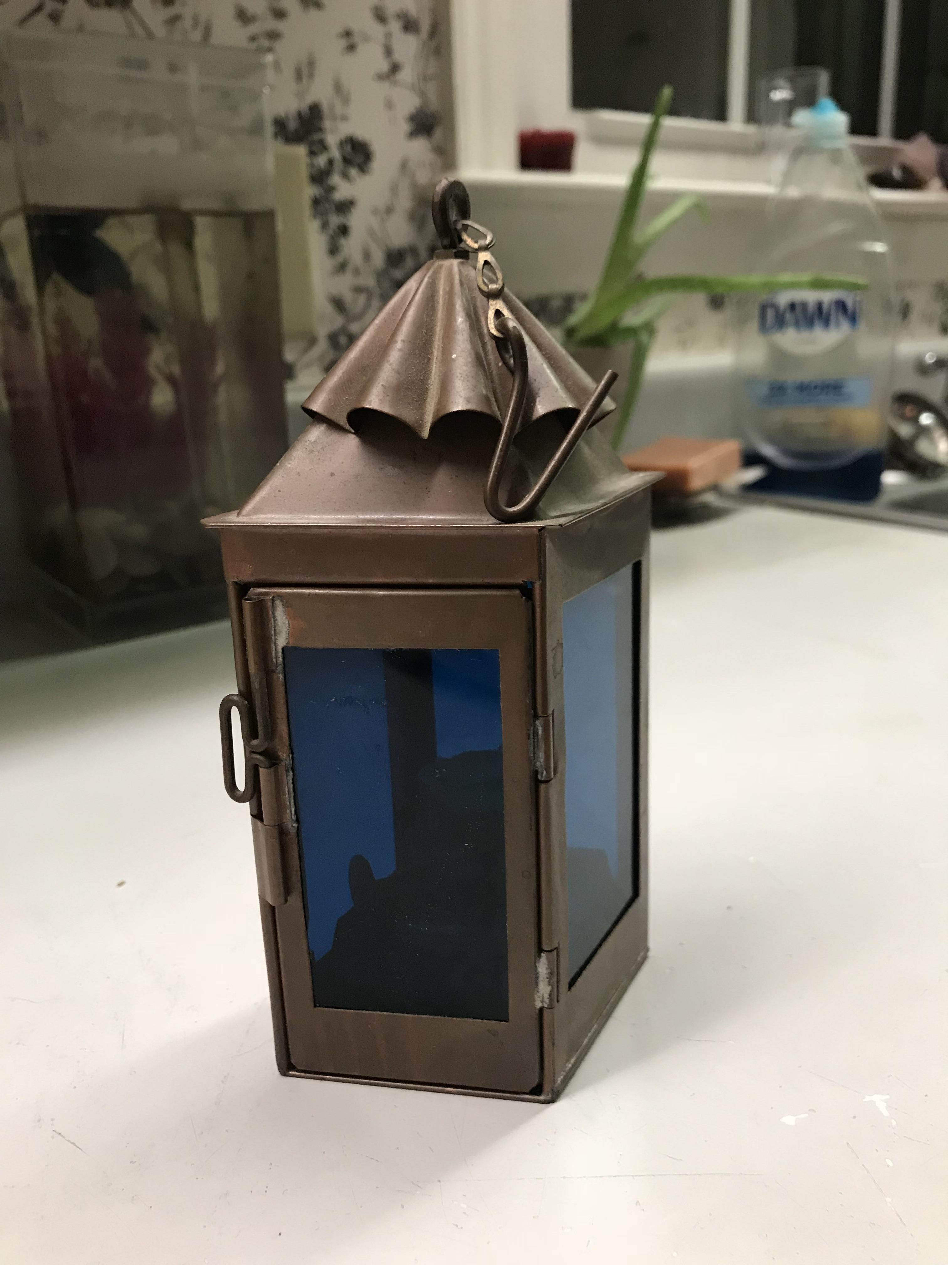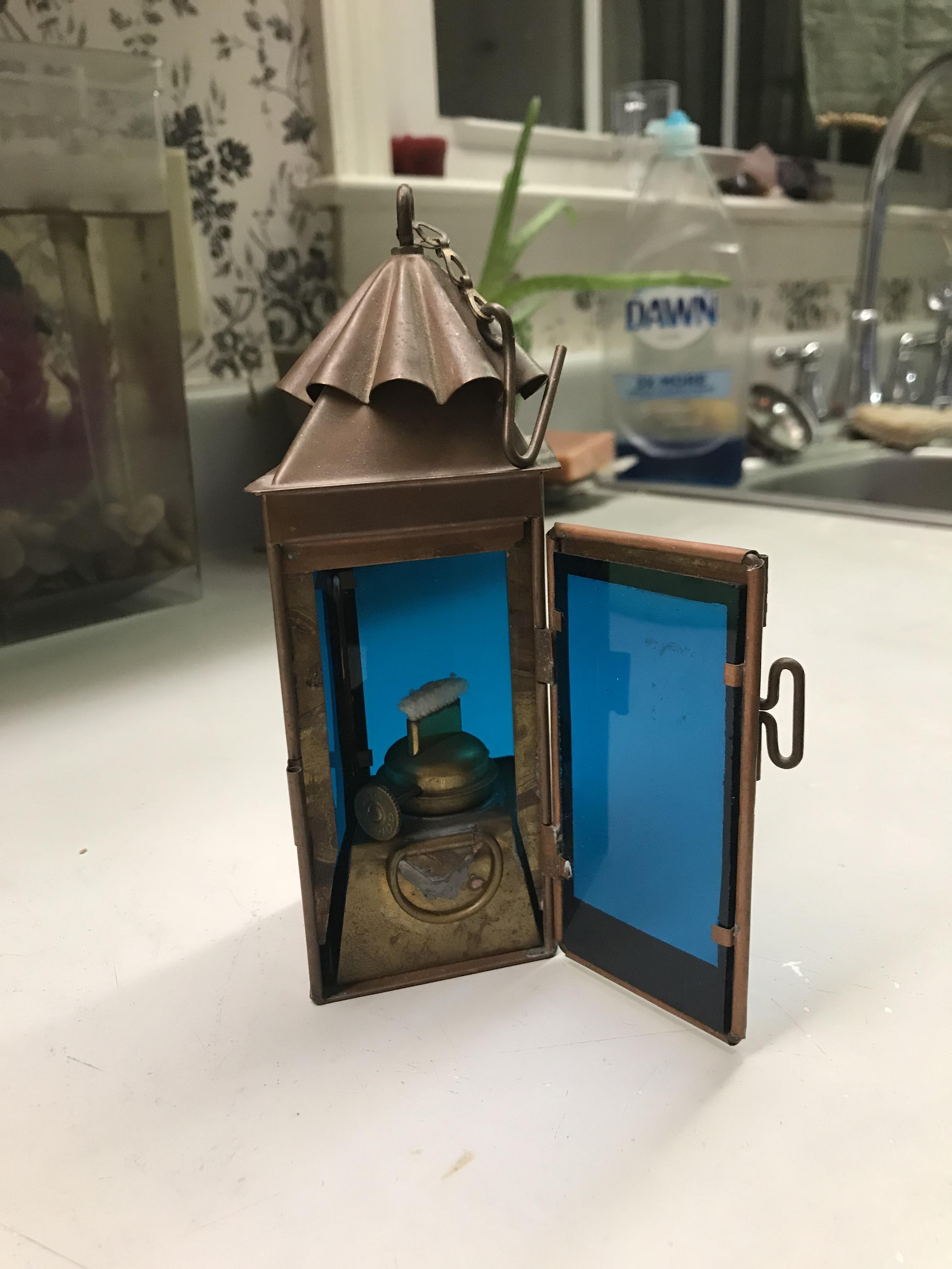 A Tung Woo Nautical Hanging Copper Lantern/ oil lamp. 6 1/2 " tall with blue glass and a side door. Slanted Square Shape