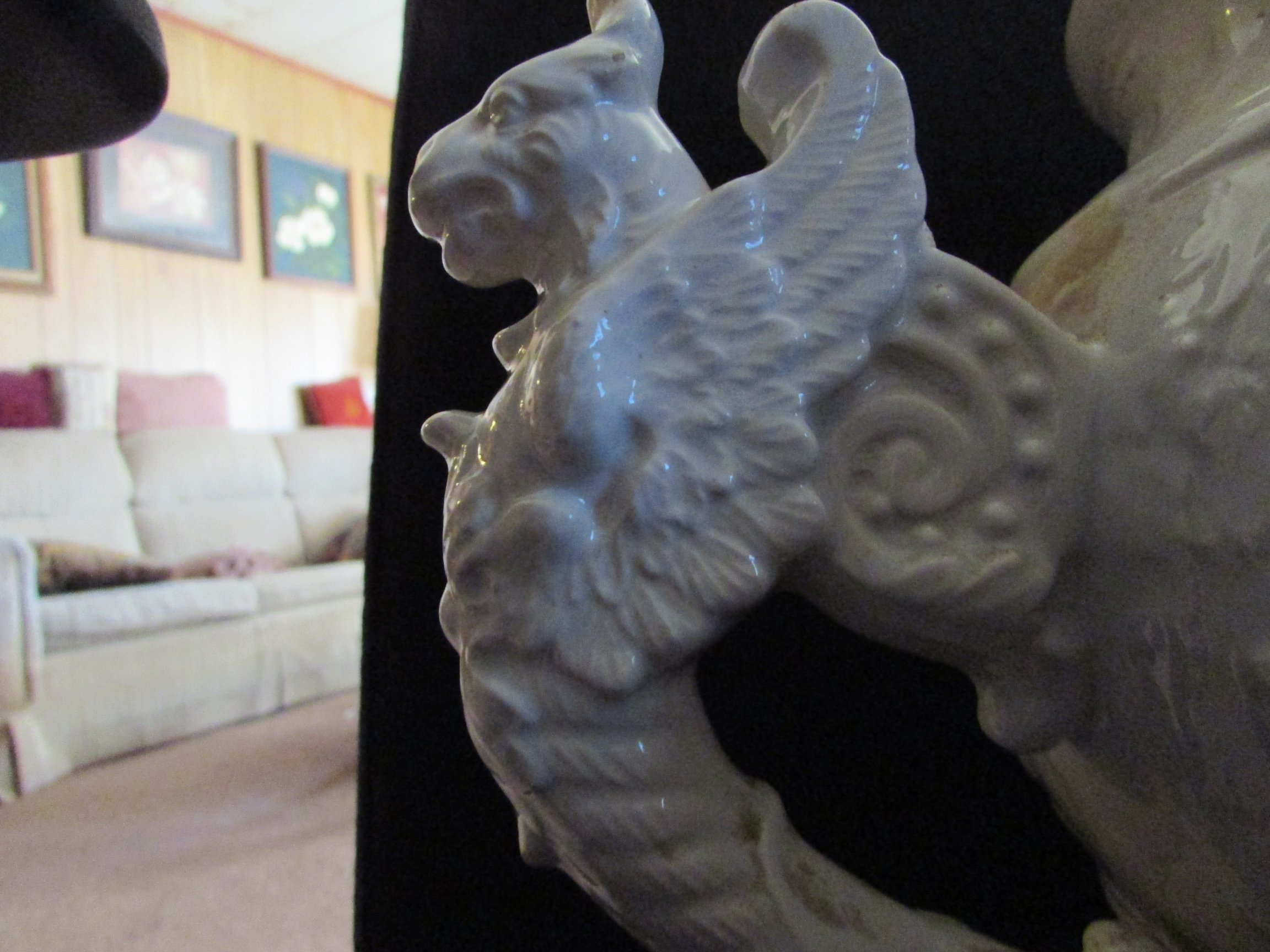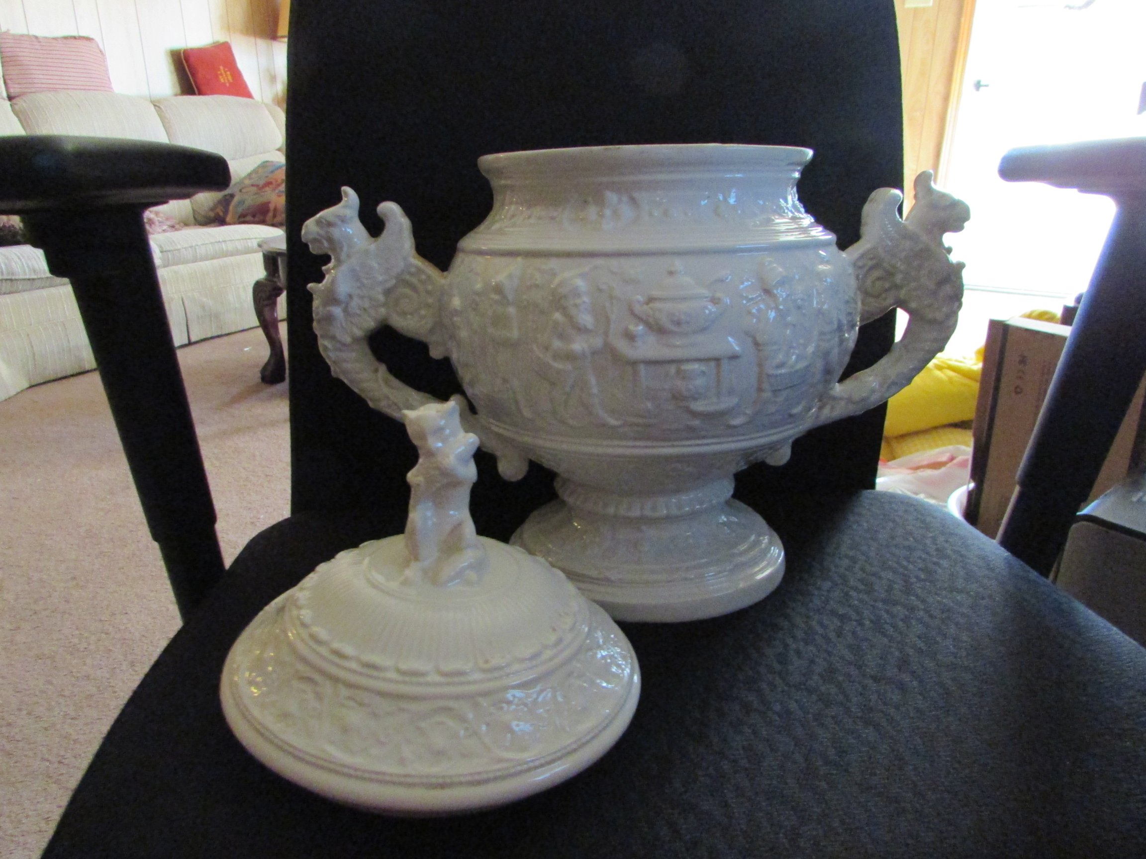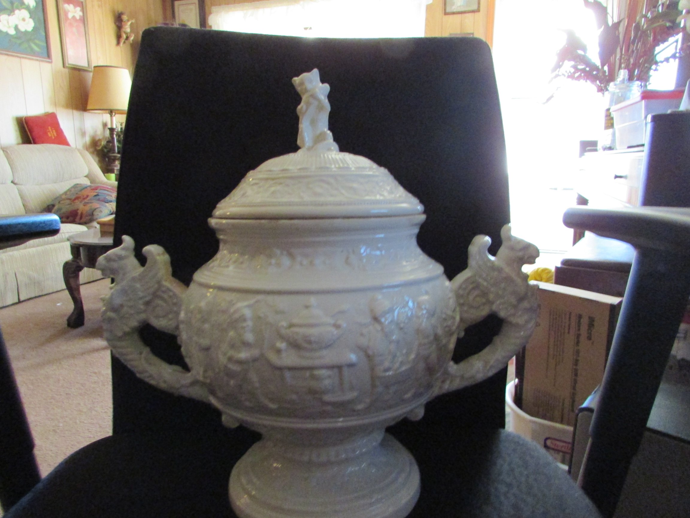 Approximately 15" tall; approximately 15" from handle tip to handle tip. Appears to have a cat holding a fish on lid. Gnomes or dwarfs around the middle, with a table holding a duplicate of the tureen. Has been in a high kitchen cabinet for who knows how many years. The only marking I see anywhere is on the bottom (appears to be L D)No idea what exactly it is, any information greatly appreciated.