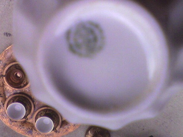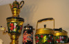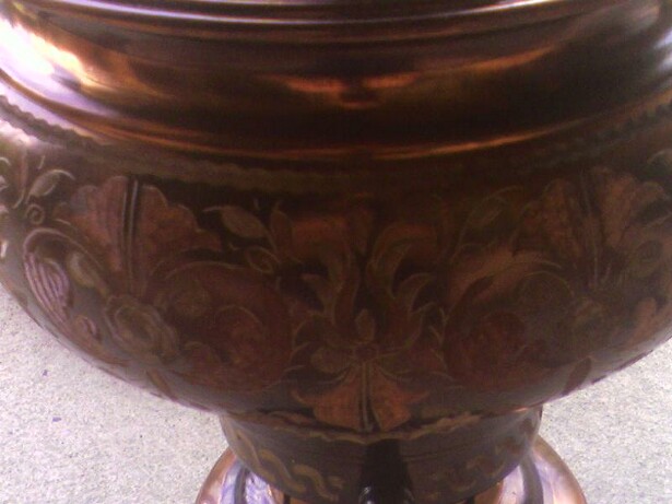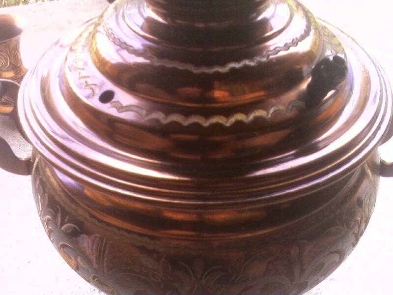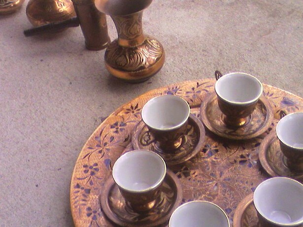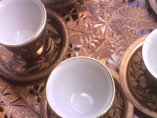 This has a lot of ornate etchings all over it. From the Samovar for the little coffee plates they are all etched with a nice floral design. There is a petena on the copper so it seems to be pretty old but it does have an electrical plug at the bottom. The cups are maybe porcelin with gold outlines.