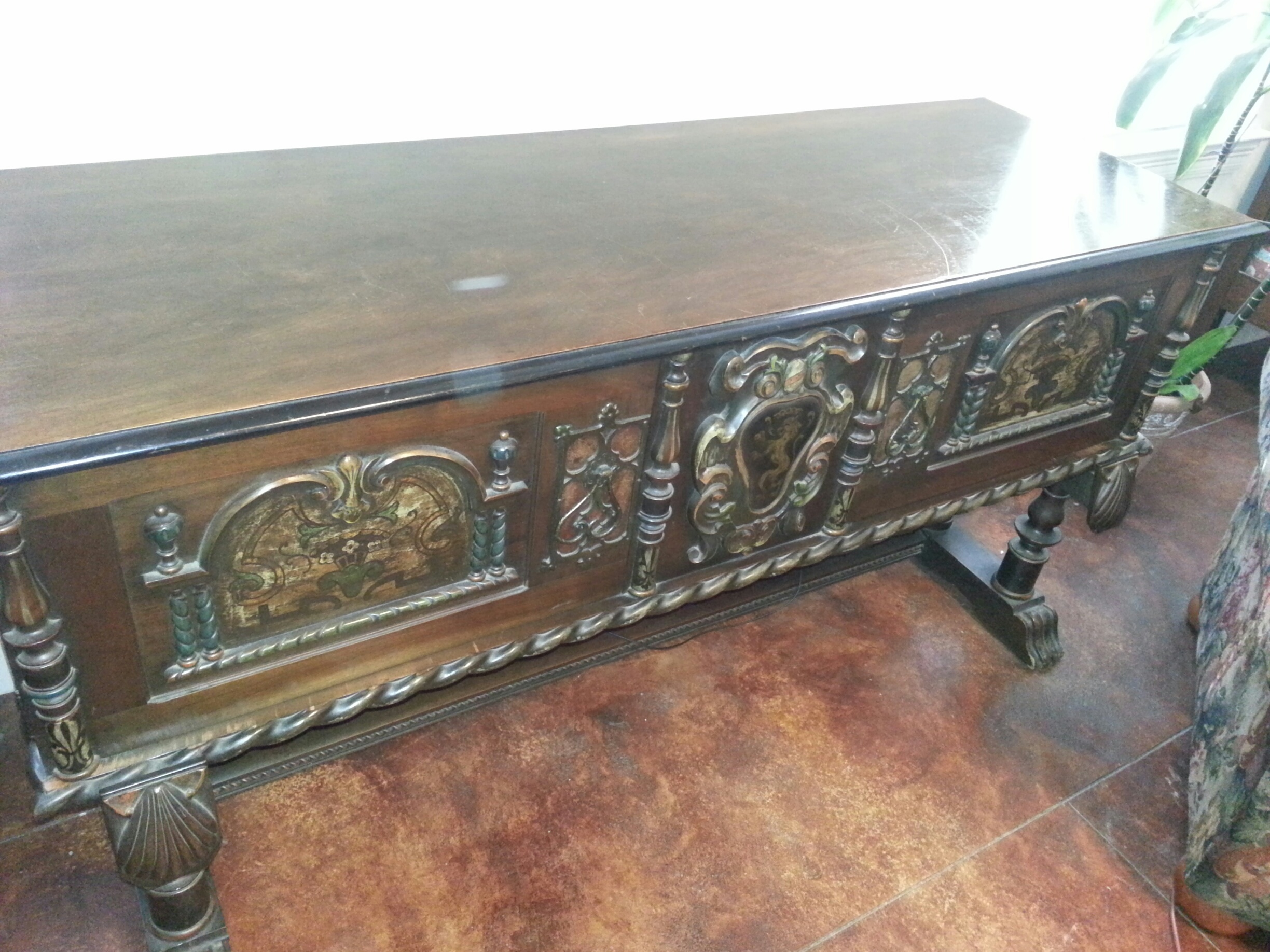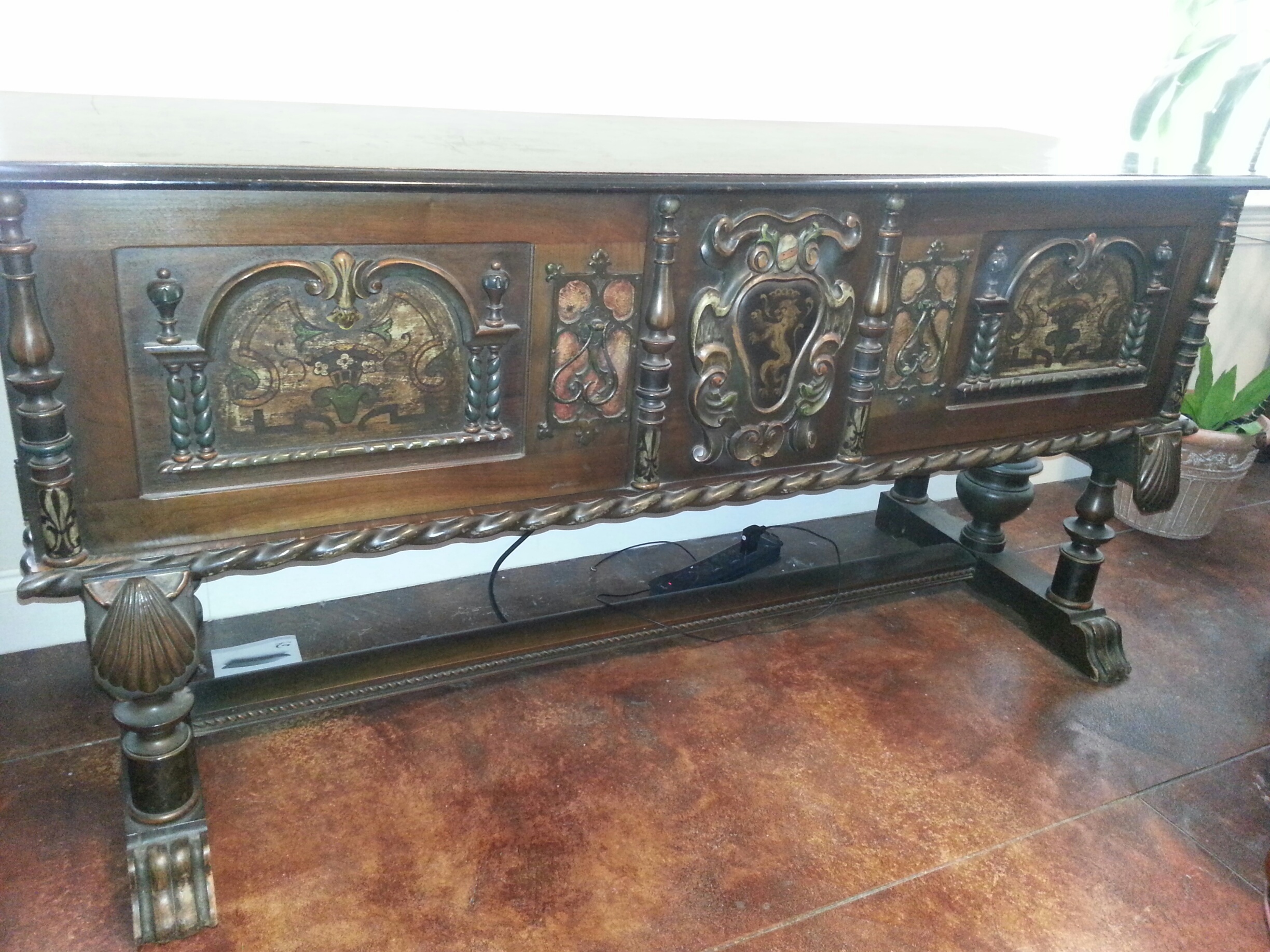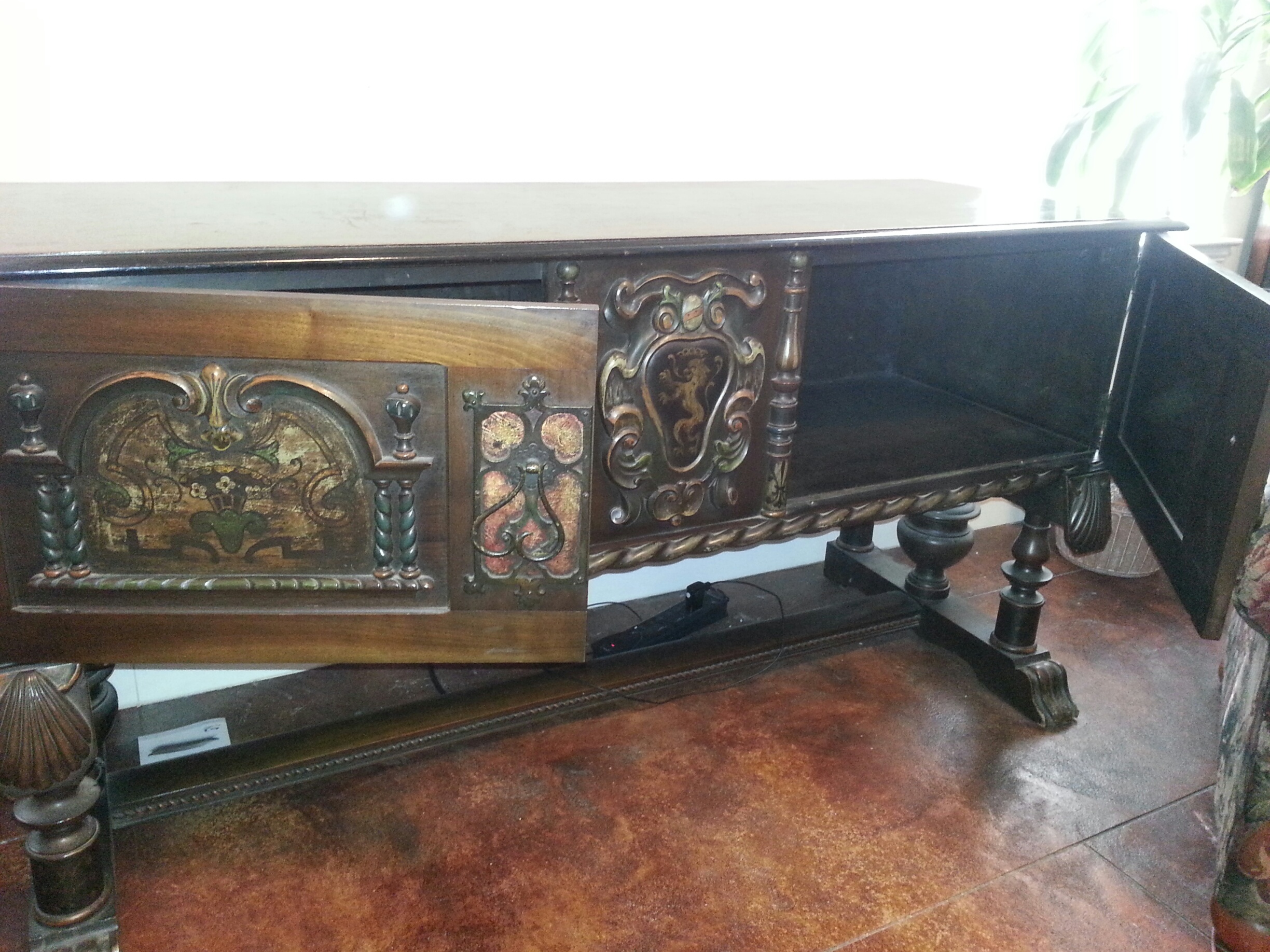 This cabinet/credenza was passed on to me upon my father's death in 2001, and, although I know he paid nearly a thousand dollars for it back in 1986-87 at an estate auction, I'm not sure what its value is now. I really would like to get a value for it ASAP in order to sell it for a decent price. The cabinet opens from the center outward, and, has an incredible amount of ornate carvings on it from top to bottom, and, has some hand painted figures on the front of both doors and in the center. The center drawing is what appears to be a lion raised up on its hind legs on a shield. It almost has the appearance of a crest of some sort. I've had a couple of people with some knowledge look at it, but, cannot seem to get anything close to an "expert" appraisal for it. I need to move this so if anyone can HELP, please do!
