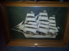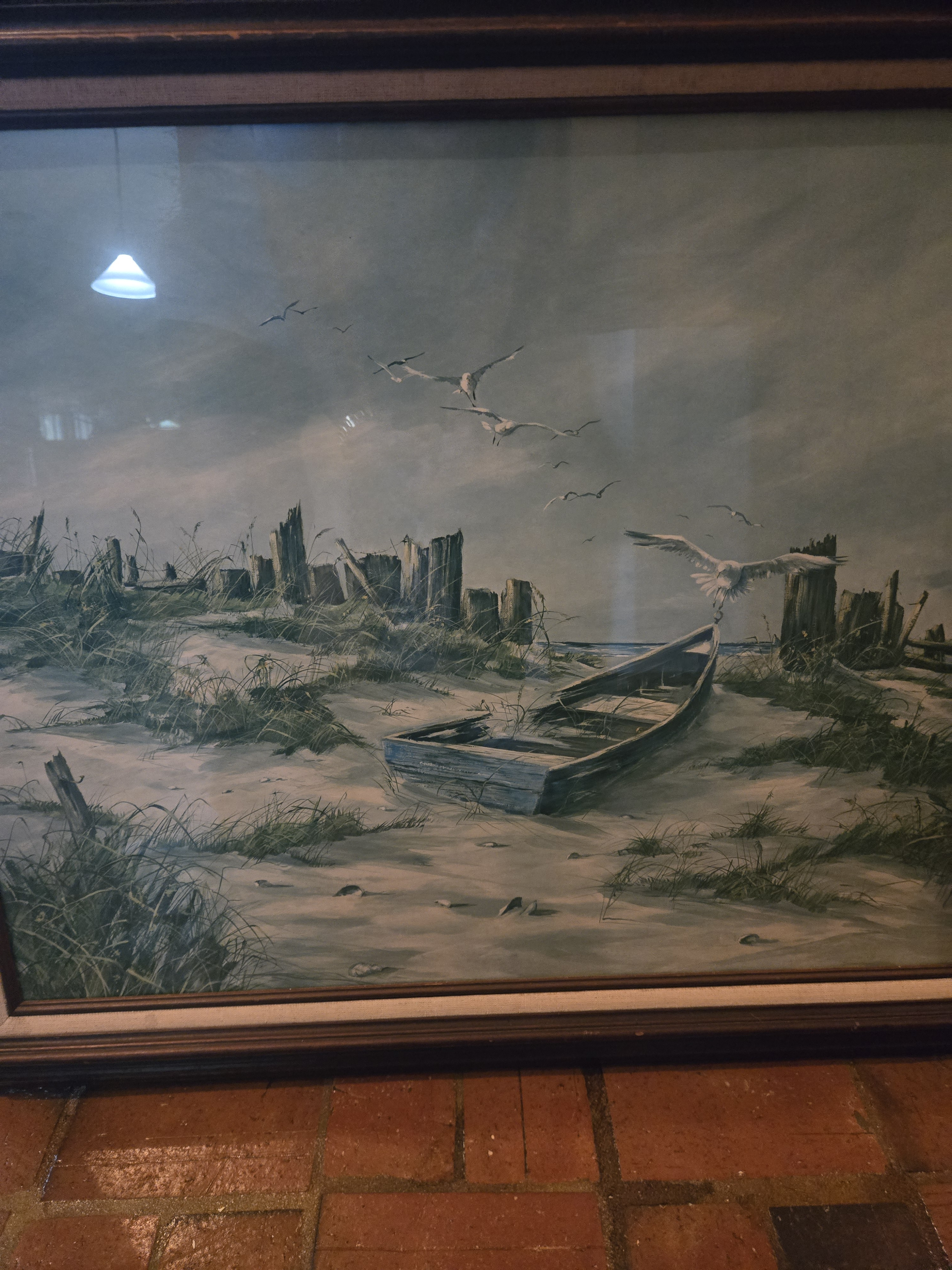 The item is in fair condition. The print shows signs of age with some discoloration and minor wear along the edges. The frame has some scratches and scuffs, which are typical for items of this age. The back label is partially torn but still legible, indicating its manufacturer and model.