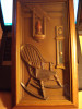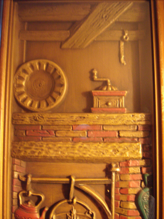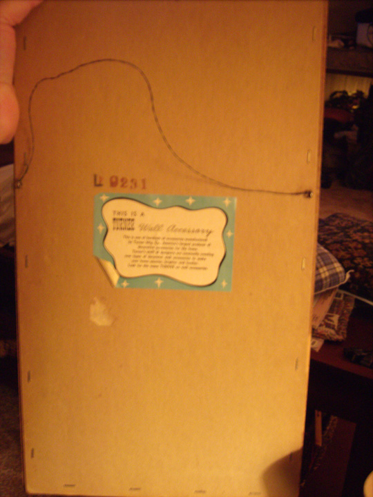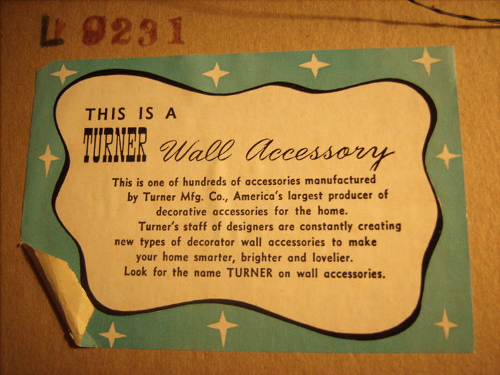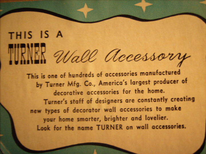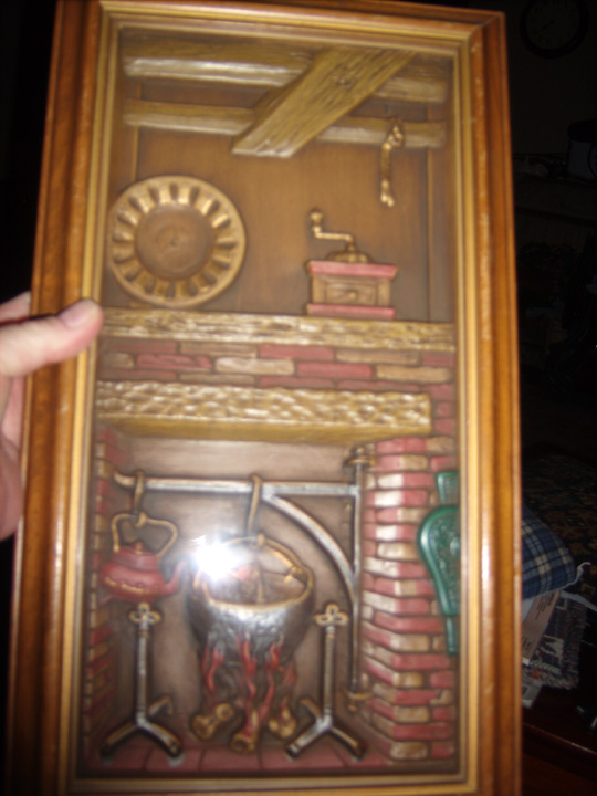 Wood frame, shadow-box style - the item is 3-dimensional, I believe it's pressed plastic. It's sealed with paper in the back, so I don't want to take it apart. it's a picture of a fireplace with and old coffee grinder and a platter on the mantle. There is a large pot cooking in the fireplace, along with a teapot. Everything is shades of brown except for reddish brick, reddish teapot, reddish trim on coffee grinder, reddish fire, and a teal-colored hand air blower. There are large wood beams at the top. The back is sealed with brown paper and has a sticker on it, which is turquoise with white retro stars, and a white area with black description: "This is a Turner Wall Accessory..." "L9231" is stamped above the sticker.