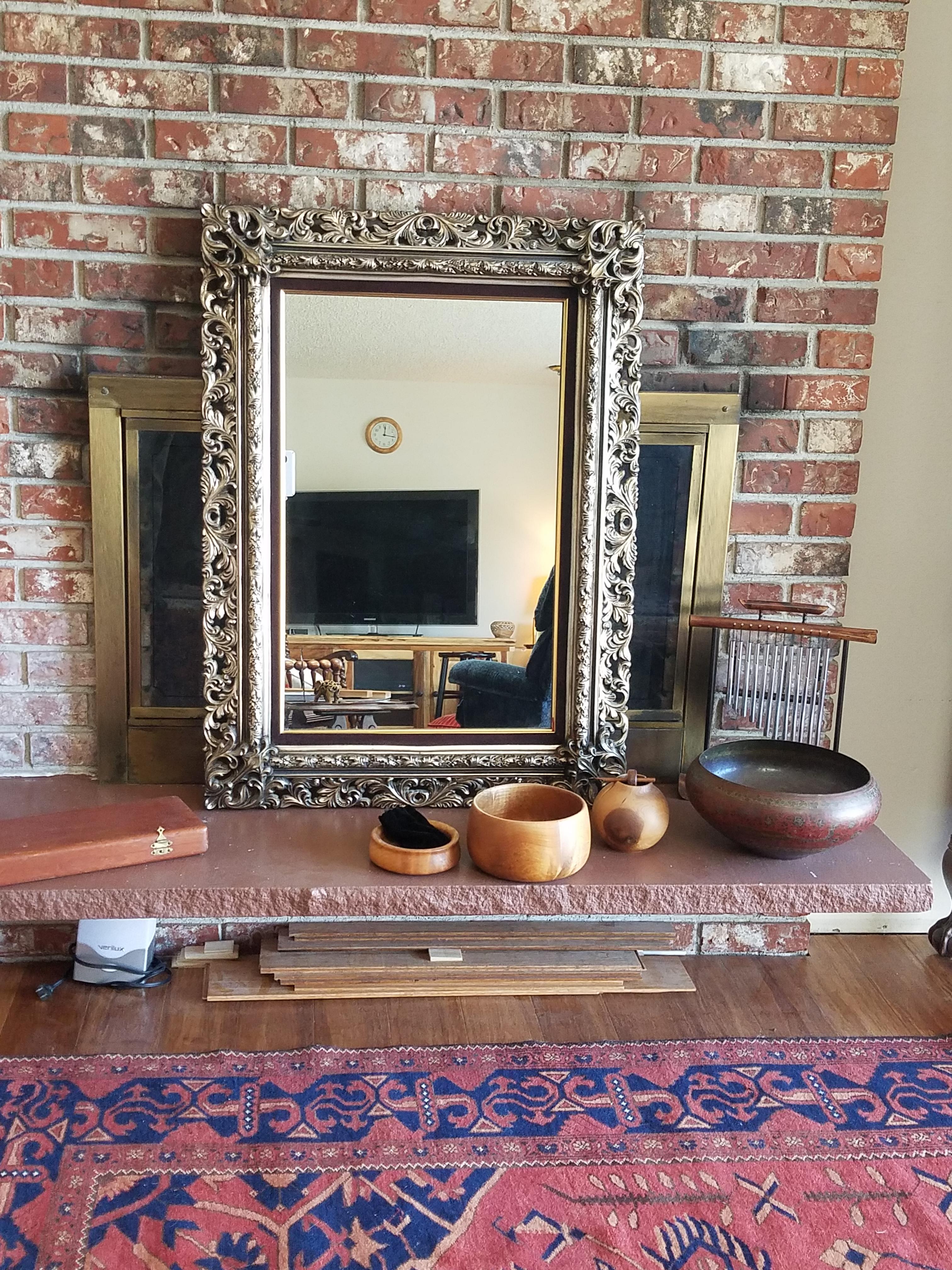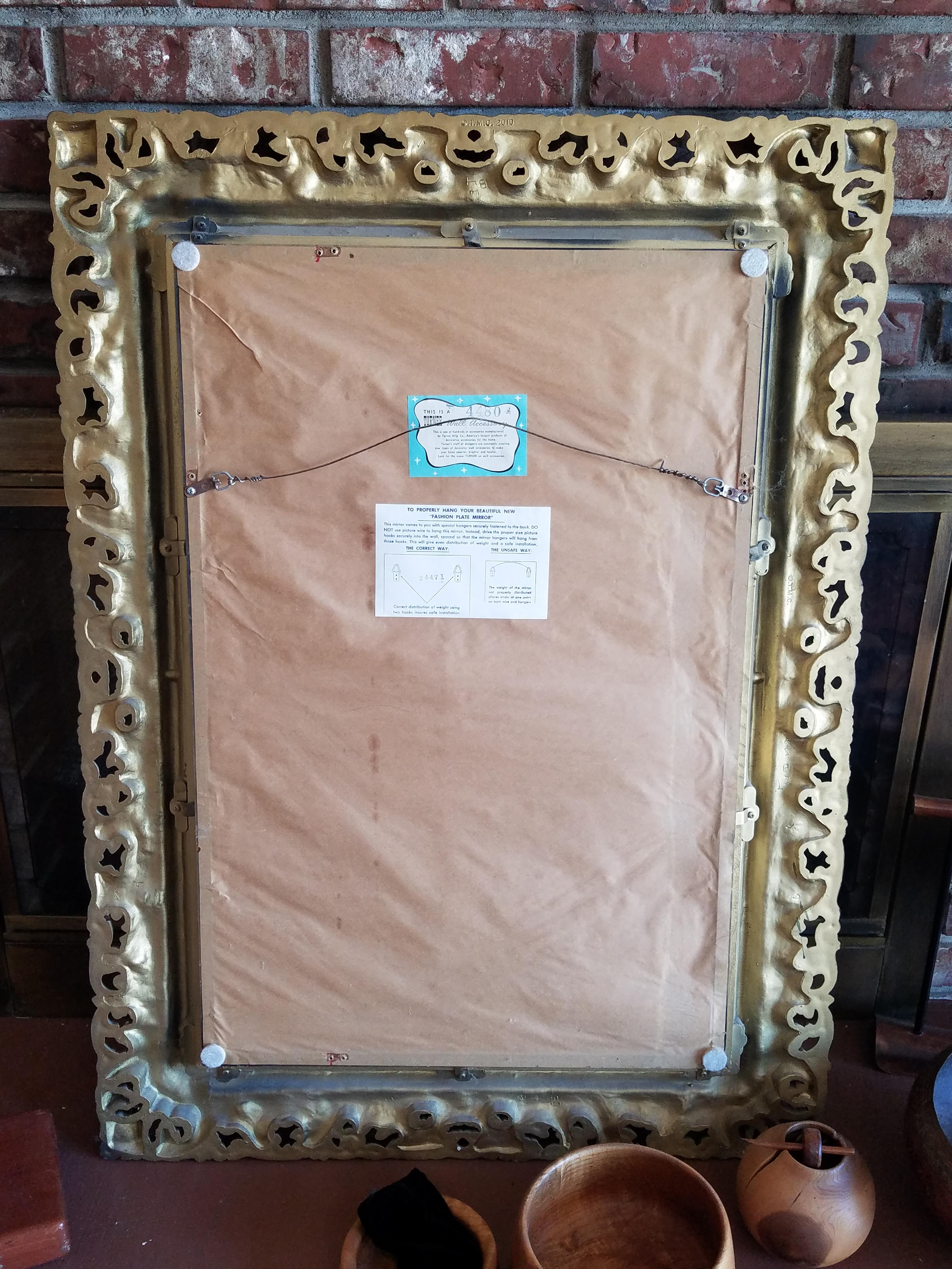 Looking for info on this mirror. Good condition with a slight loss of leaf in bottom right corner detail. Backing and original hanger intact.