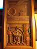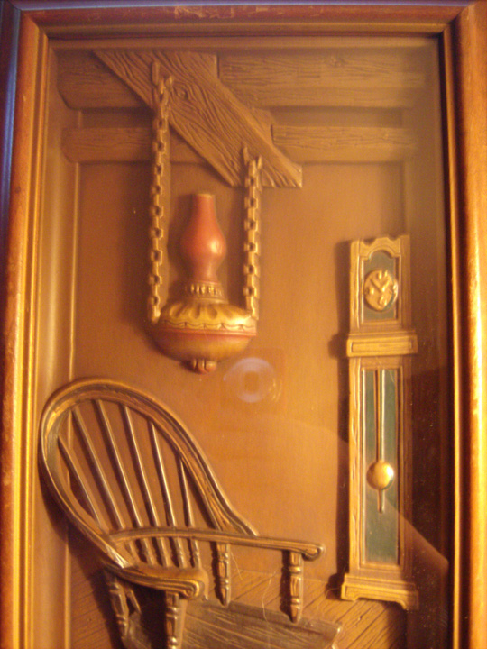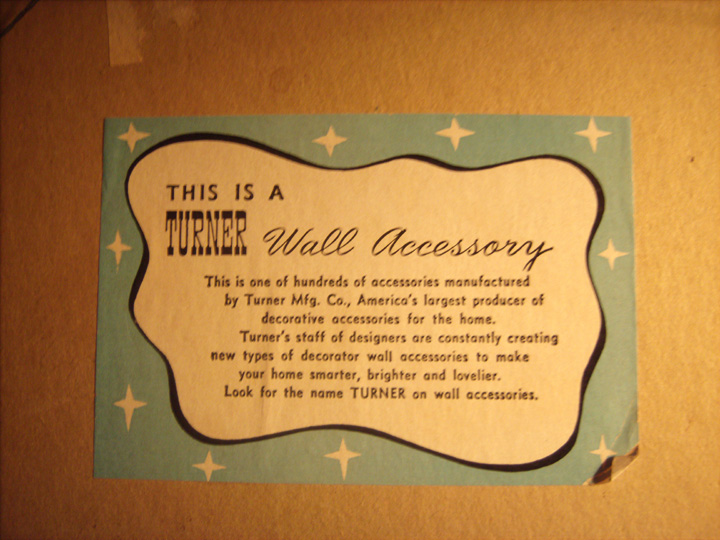 Wood frame, shadow-box style - the item is 3-dimensional, I believe it's pressed plastic. It's sealed with paper in the back, so I don't want to take it apart. it's a picture of a wooden rocking chair on a wood floor, with a grandfather clock off to the right. Hanging from the large wooden beamed ceiling is a gas lantern. Everything is shades of brown except for reddish gas lantern and green in the grandfather clock. The chair has some gold or copper colored trim, as does the grandfather clock face and pendulum. The back is sealed with brown paper and has a sticker on it, which is turquoise with white retro stars, and a white area with black description: "This is a Turner Wall Accessory..." "L9231" is stamped above the sticker.