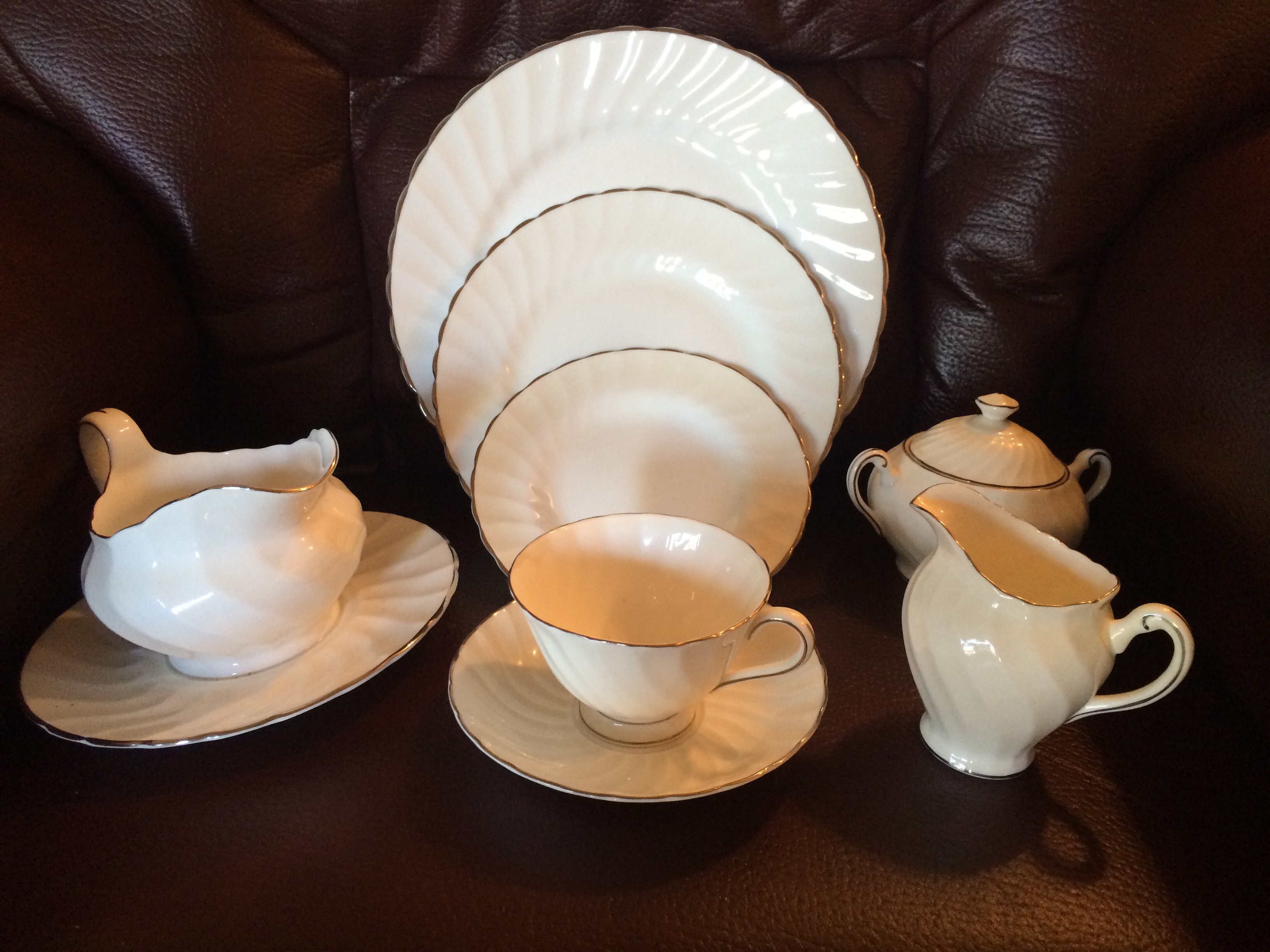 I have an incomplete set of Tuscan fine bone china from the 60's, that has I believe to be platinum trim. I have 4 dinner plates, 4 salad plates, 4 dessert plates, 3 tea cups, 8 saucers, creamer, sugar bowl and gravy boat. Not shown: I have a small platter, 2 small serving bowls and one larger one.