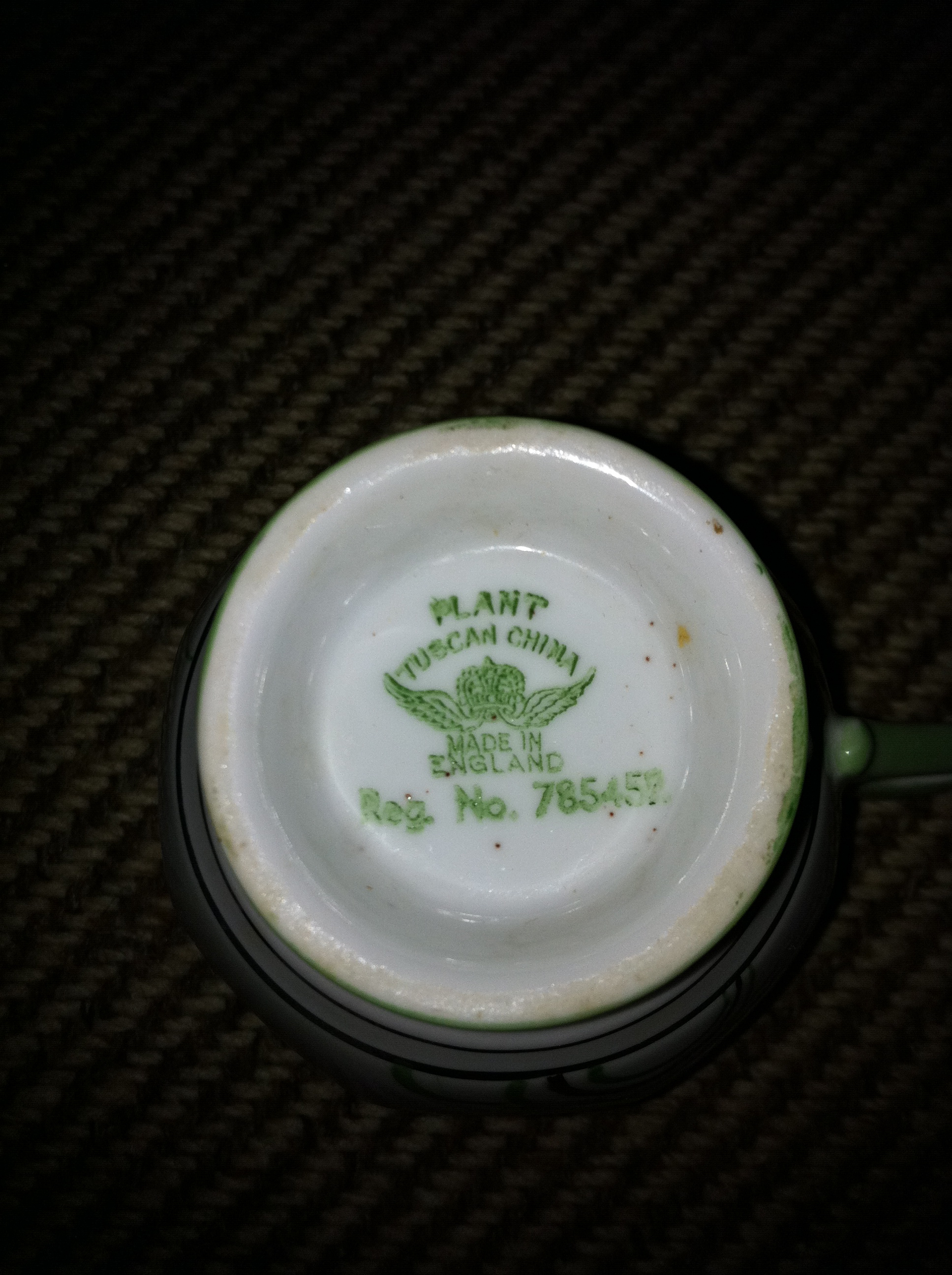 I inherited a Tuscan Plant China tea service made in England. From the mark it was made around 1936. it has 6 cups, saucers, 2 sandwich plates, 6 side plates, sugar bowl and creamer. the design of the plates is square with round edges, the pattern is green with silver edging. One cup and one side plate have been broken, the rest are in excellent condition
