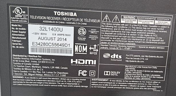 TV (Toshiba 32" Model 32L1400U) LED, HD 720p (1280x720)