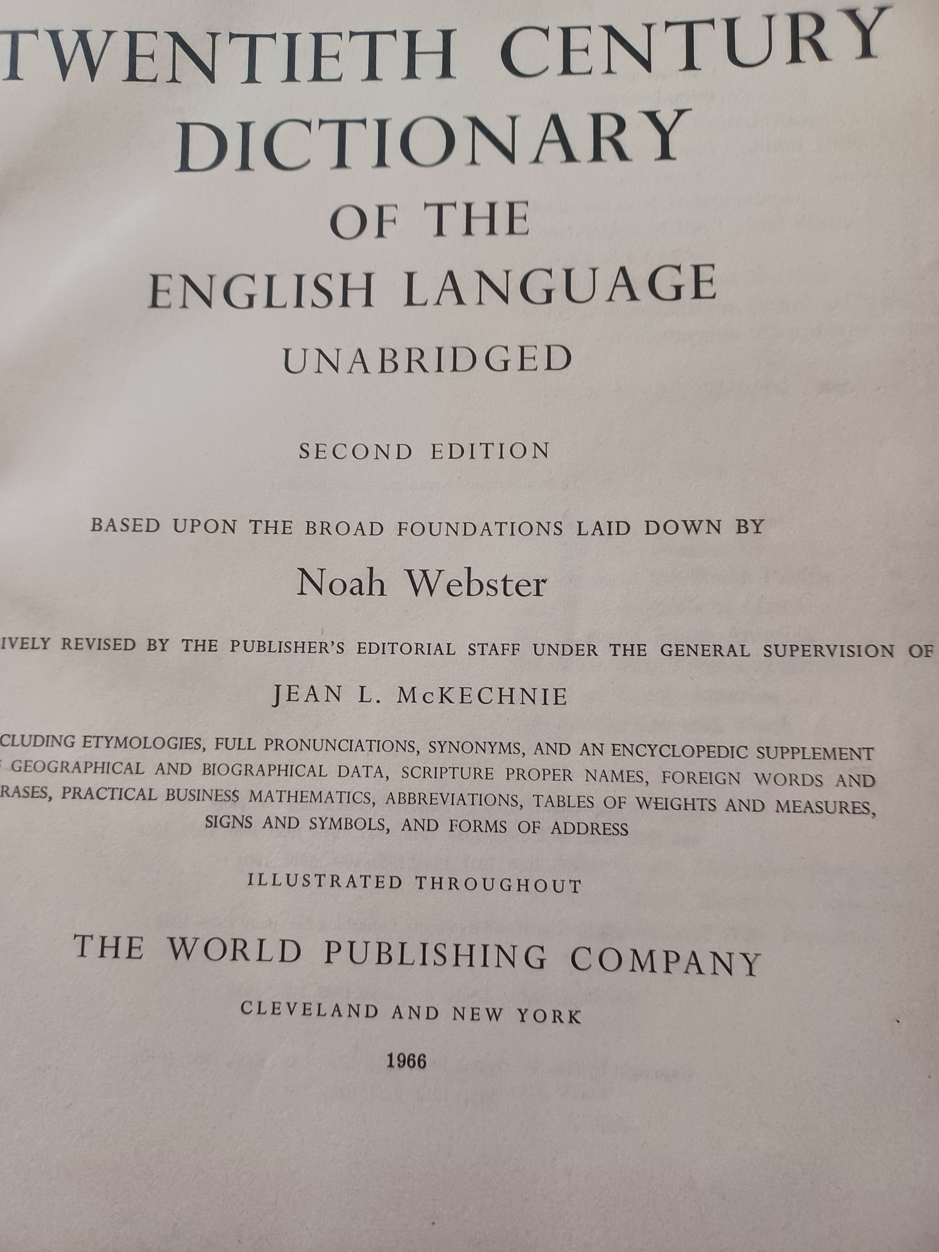 Twentieth Century Dictionary of the English Language. Made by The World Publishing Company. Dating to 1966. Materials: Paper, Cloth Cover. Estimated value: $15 – $30. Condition: Good. The market for vintage dictionaries is generally stable, with moderate demand among collectors and educational institutions.