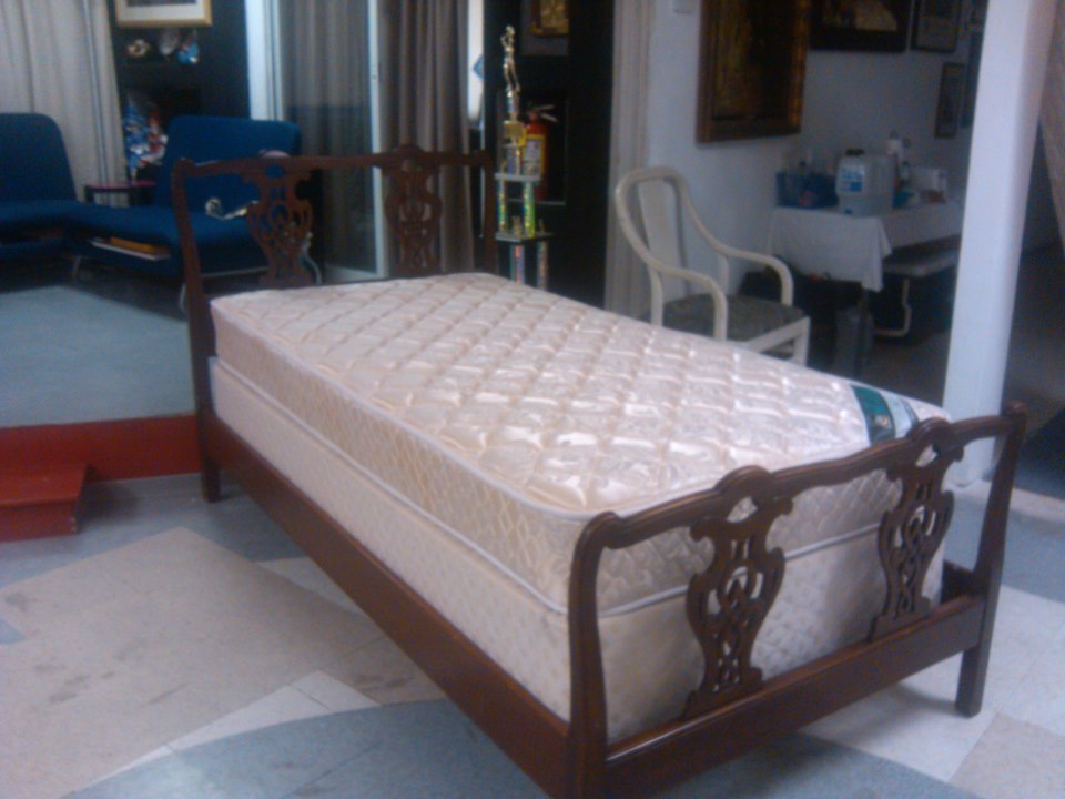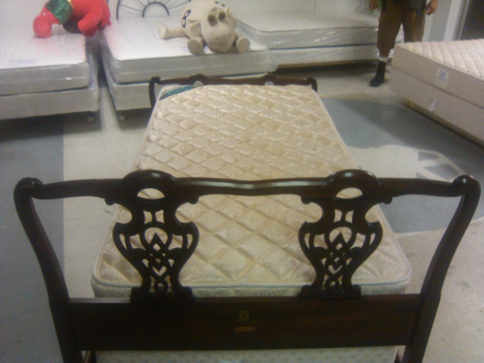 The twin bed has a Headboard, Footboard and side rails. It also has boards along the bottom to hold up the foundation. It has a carved design. I do not know what kind of wood it is made from. It is in very good condition and very sturdy. Has some scratches, but still looks very very nice.
