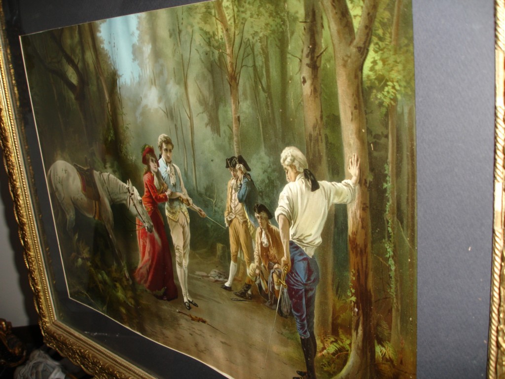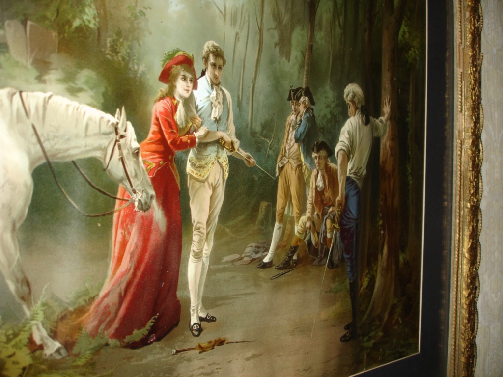 large 1800's wilson and mccallay tobacco co. advertising premium 21" x 28" chromolithograph in wood frame. this was given away with 25 tobacco wrappers. no.1 in a series of 3 titled twixt love and honor by laslett pott. the number 2 print entitled two's company, three's a crowd and number 3 entitled war in the desert