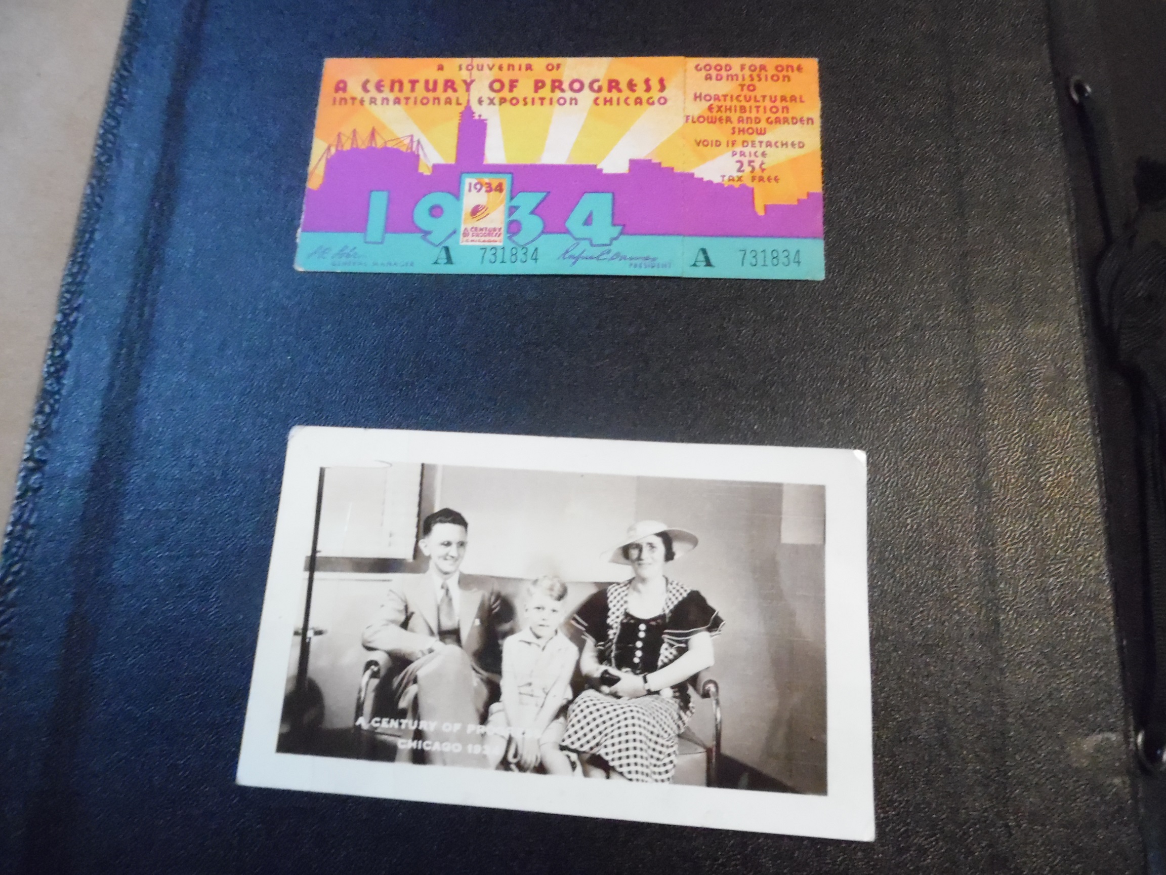 I have two leather bound and embossed photo albums from the 1934 Century of Progress in Chicago. Each album measures approx. 8 1/2 by 11 by 3 inches and hold over 100 photos in each album. This came from the estate of my husband's coworkers father-in-law who worked for Kodak at the time of the fair. His ticket stub and family photo are included. The remainder of the pictures appear to be "official" with the name on each. Each album has different photos.