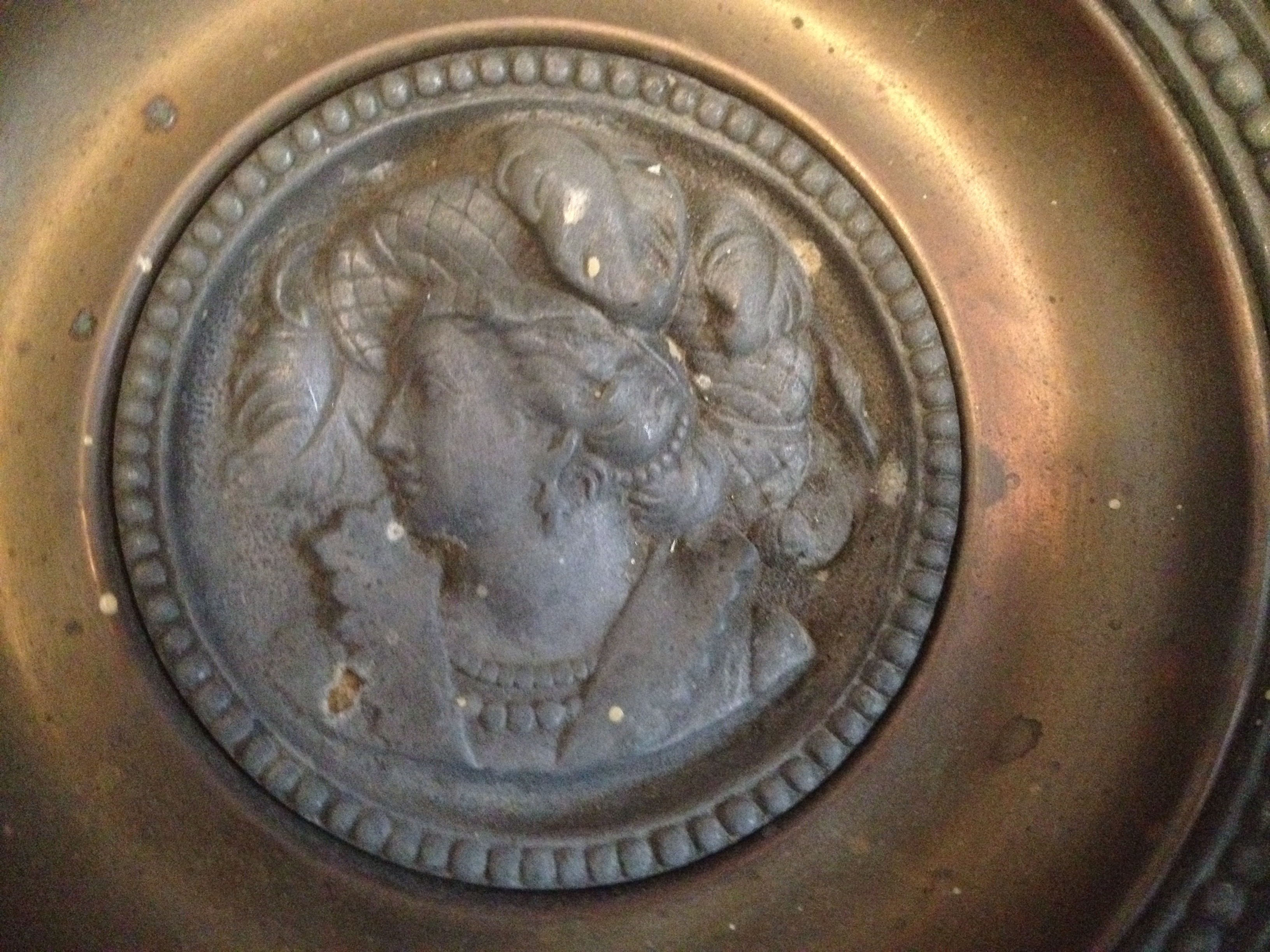 The bronze medalion shows a profile of a woman maybe Marie Antoinette