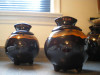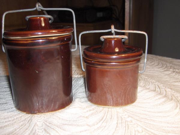 The second brown glazed jar has a lid and metal fastener as well, it is 2 3/4" in diameter and is 4" high with the lid on.