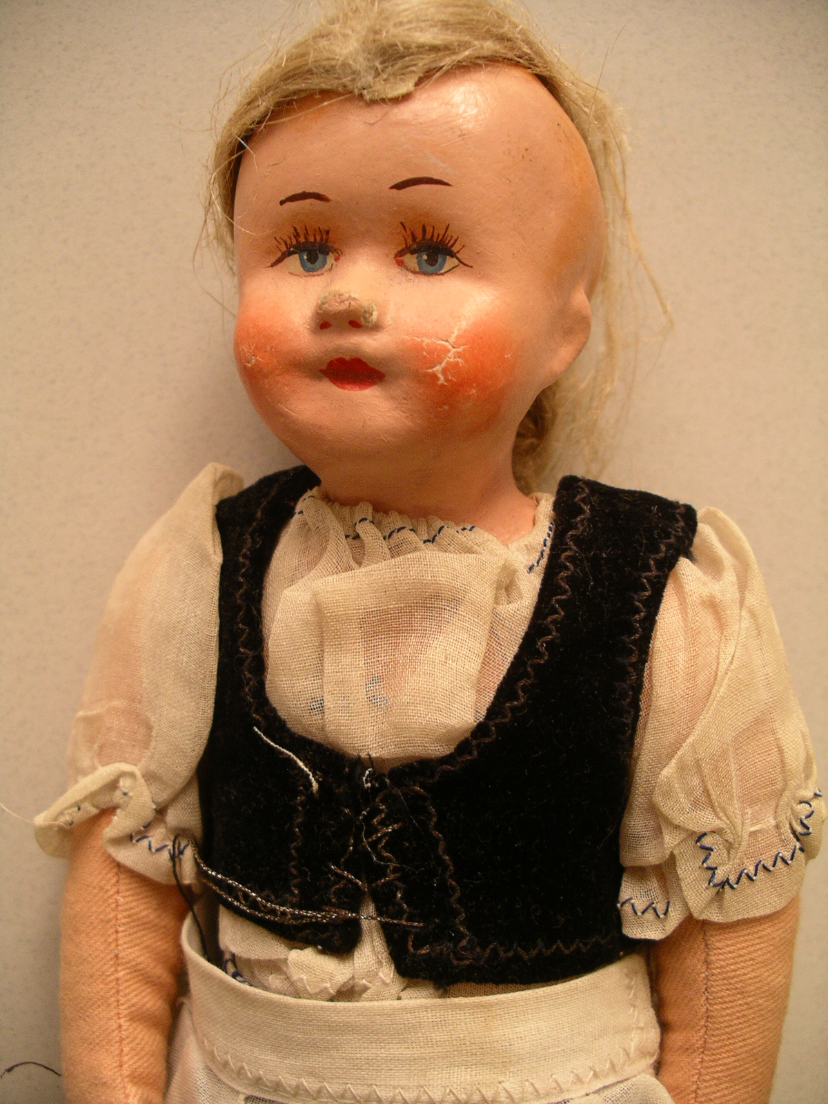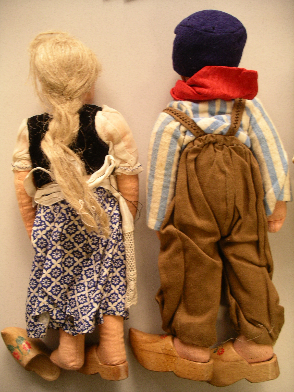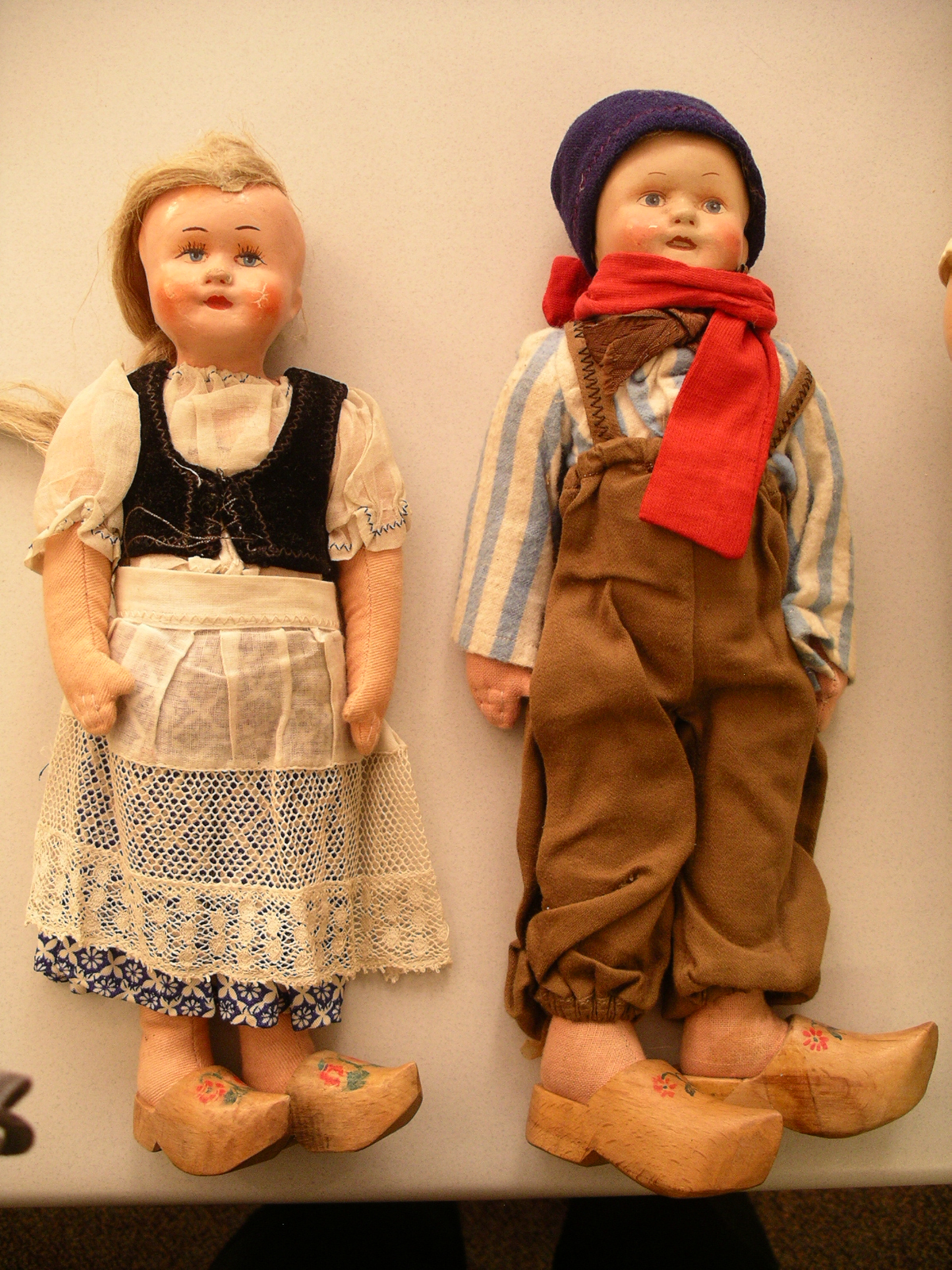 Male and female dolls with wooden carved shoes - and what look to be biscaloid heads. We do not know much about these dolls except that they belonged to father's mother (he was born in 1923).