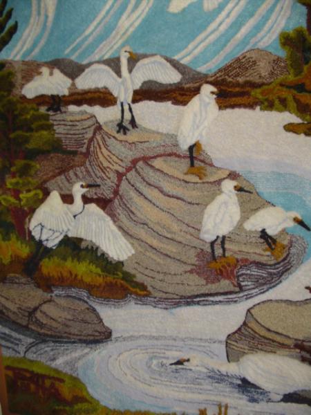 These tapestries/wall hangings (of which there are three in total) are original art works made of wool yarn using the hook and loop method. They are very large (83" x 62") and vibrant in color, composition, and texture. They have simple wood frames. They were probably crafted in the 1960's or 1970's. One is a scene of cranes; the second is a waterfall and surrounding area; and the third, which is not shown, is of Joshoa Tree (desert scene).