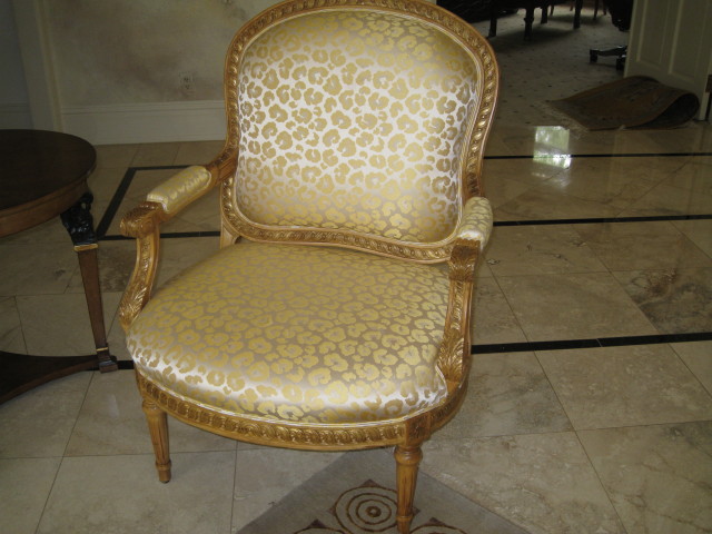 - very fine hand carved chairs of palace scale covered in yellow animal print silk