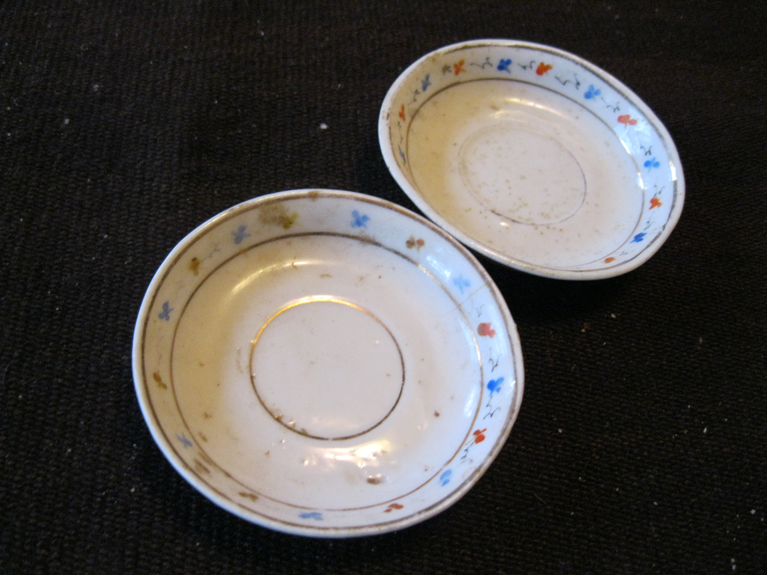 I bought three of these for $1 each just to put jewelry/earrings in for my dresser. They are odd--seem to be made of fine china--they are not opaque--but they are pitted, not of uniform shape, and the painting of the blue and orange markings appears to have been done hastily. Yet, there is gold markings, and someone went through the trouble to make these. I mostly have been wondering where they could have come from, and why are they so odd--like someone made them from hand. They have faded since I have owned them, because I was putting items in them. Just an oddity, I suppose.
