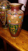 These vases were bought at an auction by my husband's grandparents in the early 1920"s I believe. They stand about 10 inches high. Colours are varied with cobalt blue and what looks to be hand painted figures on both vases. The details and paint on the one vase are raised and flat on the other. There is a lot of gold paint used on both vases. The markings on the bottom of both vases are fairly simple as per the attached photos.