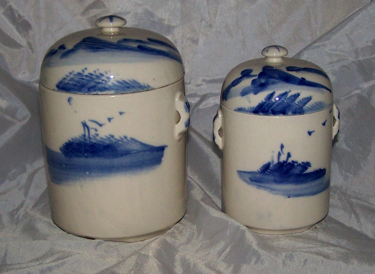 I am selling a pair of Peoples Republic of China, Blue & White Tea Caddie or Ginger Jar, depicting a Ship and Scenery.