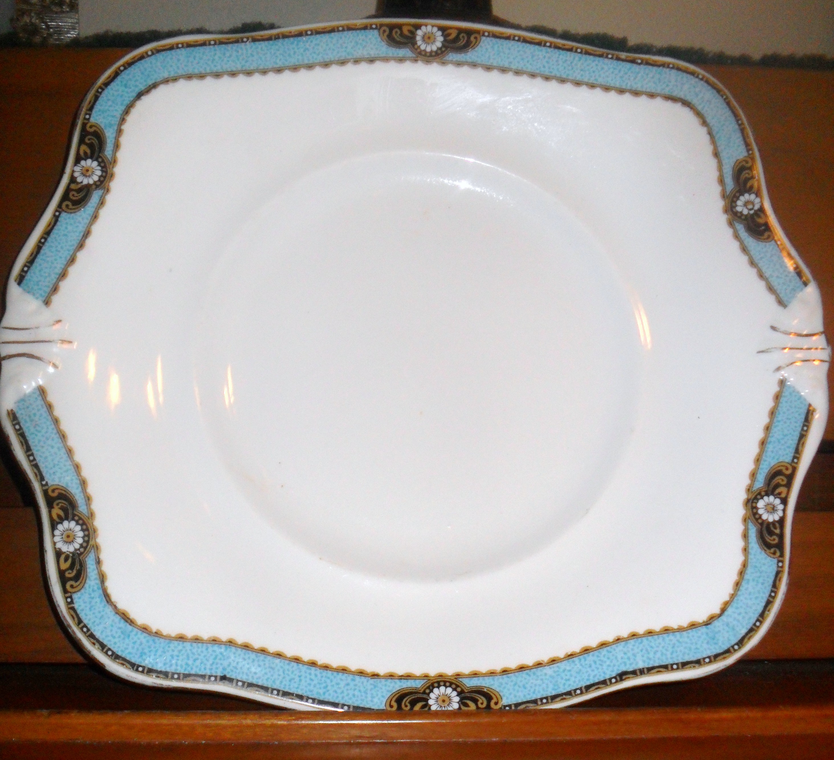I have 2 (two) cake plates that have on the back Plant Tuscan China Made in England. From the marking and online research I have found it is a circa 1936 piece. They are white plates with an aqua border with gold and black on either side. There are 6 white flowers on the plates at the rims(One on top, one on bottom, two on each side). I have not been able to determine the pattern of the china. I've determined they are cake plates from their shapes and comparing them to similar plates online. If anyone knows the pattern and what they are worth, please respond. Thank you