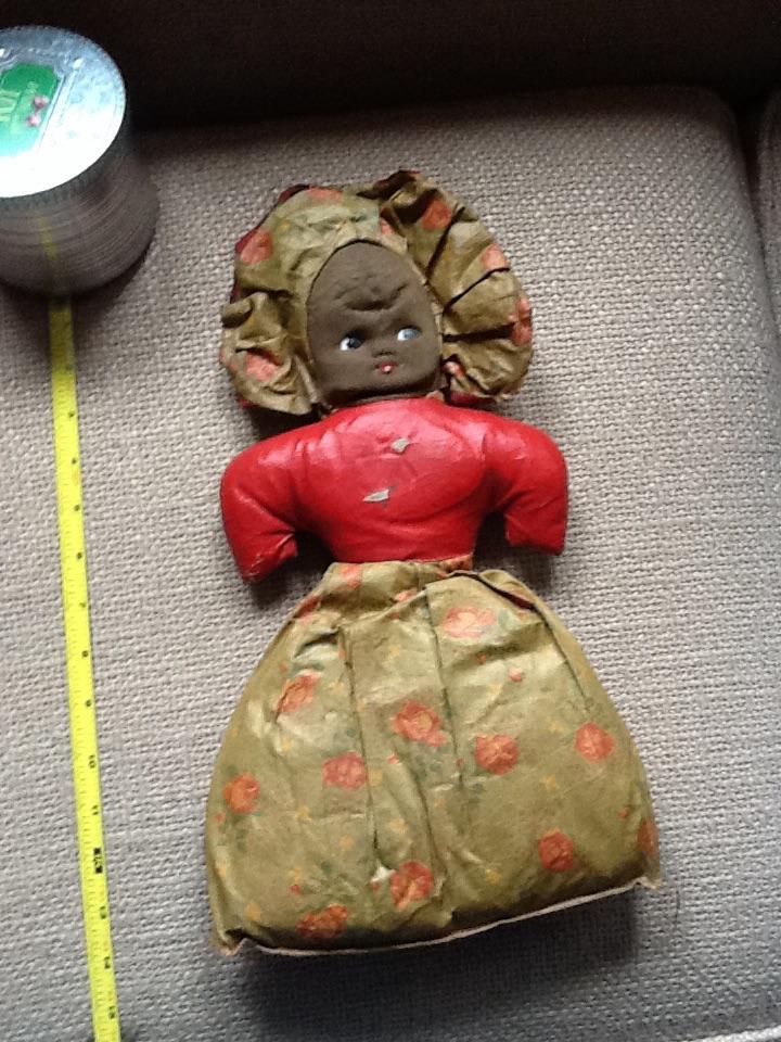 This is a cloth doll with two sides - one side has agirl with a black face and the other has a girl with a white fax.  The cloth is stiff and shiny - maybe some type of canvas?  The doll is about 15 inches tall.  Photos of each side are attached. Can anyone advise as to the approximate vintage and value?  Many thanks.