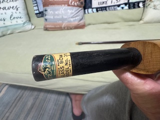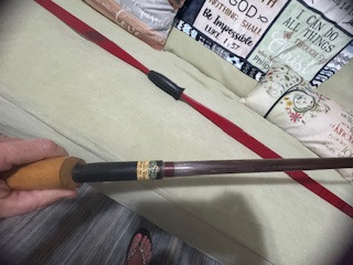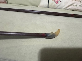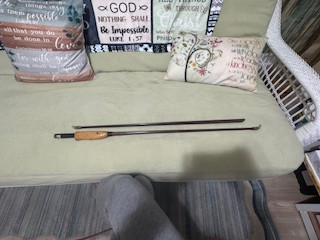 2.) Label says "Stream-EZE trademark glass bow Model No.35 Grayling, MICH" It is a bow that was built to break down into two pieces. It appears to be mostly wooden but has two ends that look like bone but may actually be some type of hard plastic. There is a metal piece that is below the wooden handle that has a label sticker that is yellowed with age but easily legible. The label states the company and name, as listed above. The metal piece is where the two halves of the bow fit together. There are only a couple of scratches. no repairs or signs of damage or weakening. No cracks. No original paperwork or accessories. Bow is not strung.
