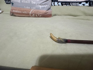2.) wooden with metal below handle where two halves fit together. bone tips on either end, or may be hard plastic made to look like bone.