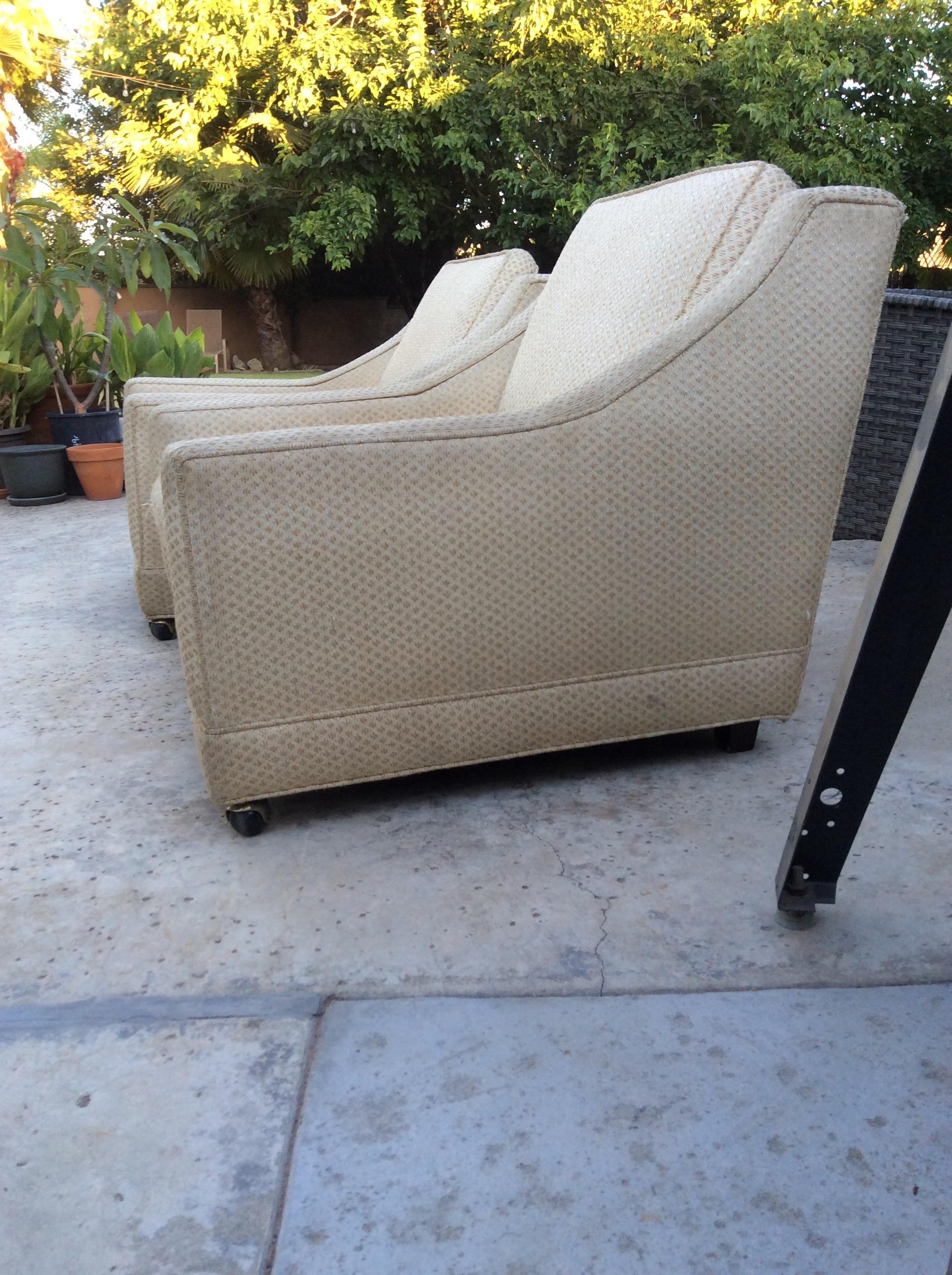 This is a pair of W & J Sloan chairs. Front legs are casters and the back legs are wood. The chairs are in good condition with some wear on the seat cushions and arm rests. Took a picture of the tag under the seat cushion with all the information.