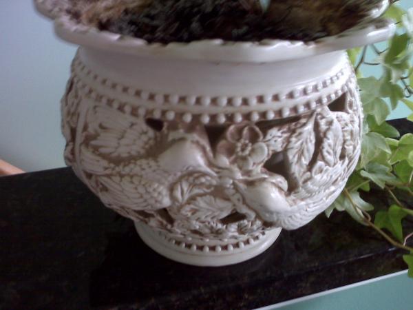 Porcelain or bisque, ivory colored, vase with kissing birds, leaves, flowers, all hand carved.