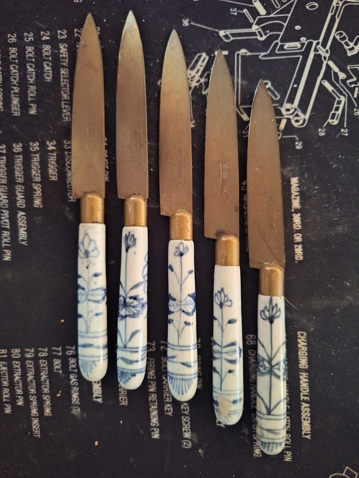 This lot consists of five vintage Uchatius bronze fruit knives, each featuring porcelain handles adorned with a blue onion pattern. The knives exhibit a classic design, with a bronze blade and a smooth porcelain grip, making them both functional and decorative.