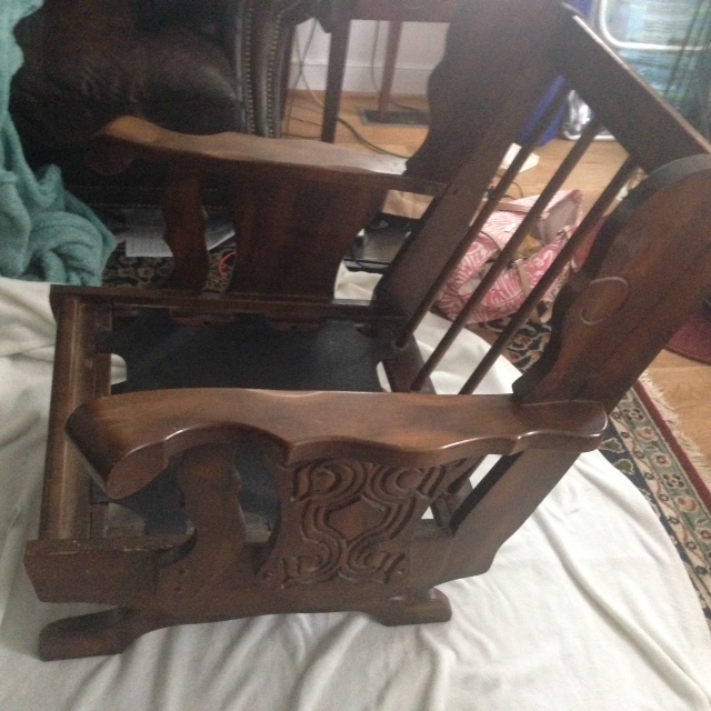 Purchased a Flip Home built in 1950 and this platform rocker was found in the home. The bottom of the seat says Elasta Seat by Acushnet Process Co. New Bedford, MA. The chair is carved on the sides but the arms are so ugly! Is it worth anything? Looks like it was rarely used, excellent condition, to bad its so unattractive!