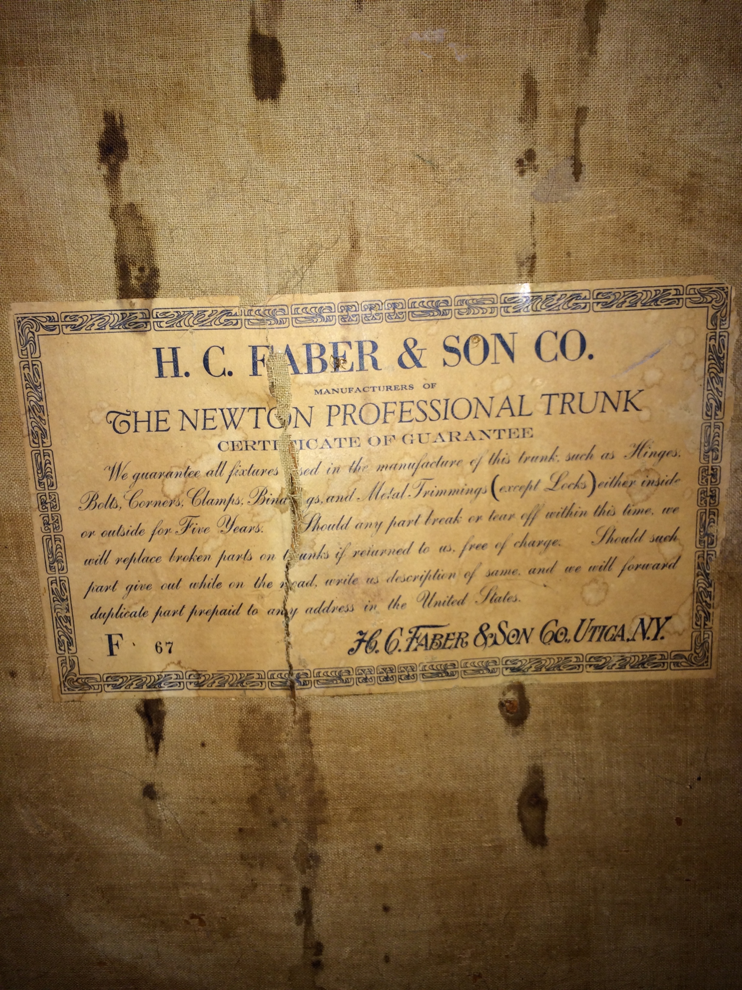 The inside of the trunk has a label saying it was manufactured by H.C. Faber and son Company, yet the outside lock says it was made by WH Newton and Son. I have been unable to pinpoint any more information on the trunk, other than it was once owned by the Eddie Hill Theatre group. Any help is appreciated, thanks.