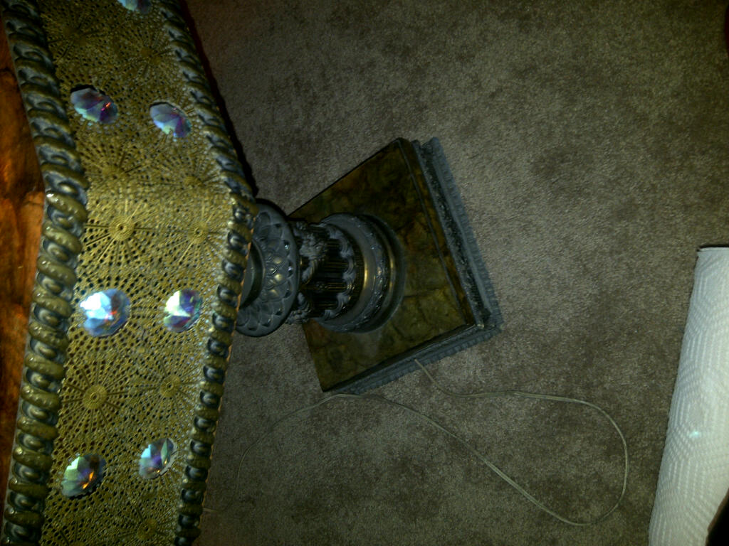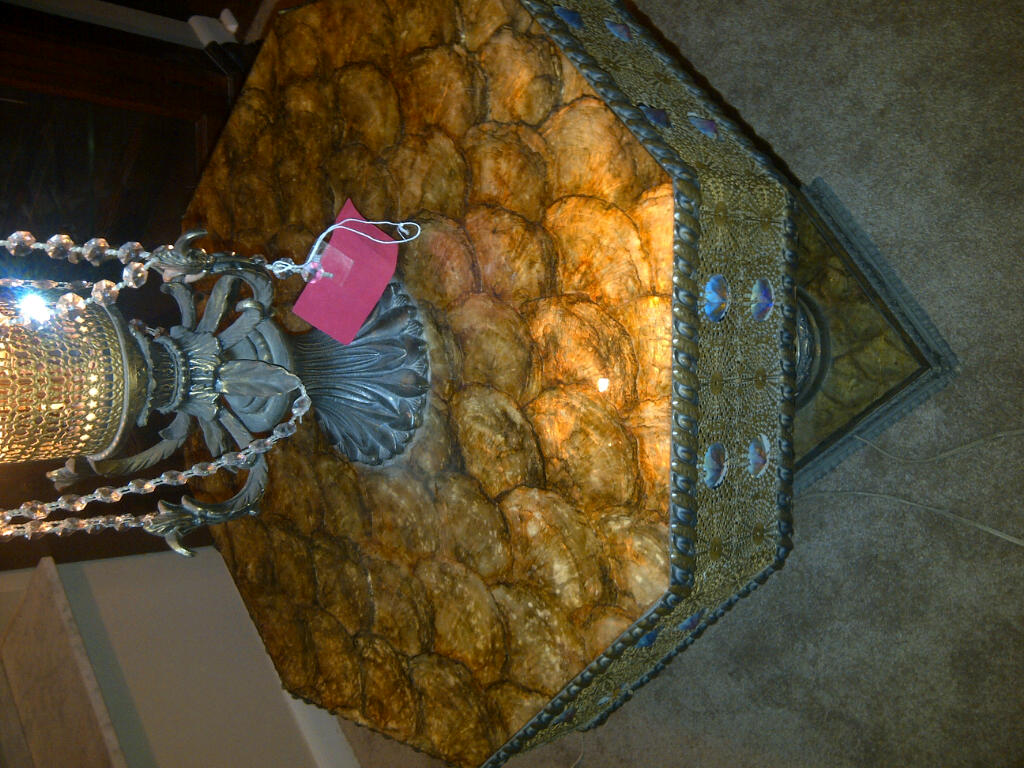 I have a very unique lamp. its over 6ft tall and has a very large tan shade. The shade is a soft velour material. The column is metal and has crystal beading on it and strings of crystal beads. There is a light inside the column. The table has a shell inlay with a matching metal edging with crystals. There are 3 lights under he table. The switch on the side controls the column and table lights and can be varied with the ights on or off. The main light is just a switch by the bulb.