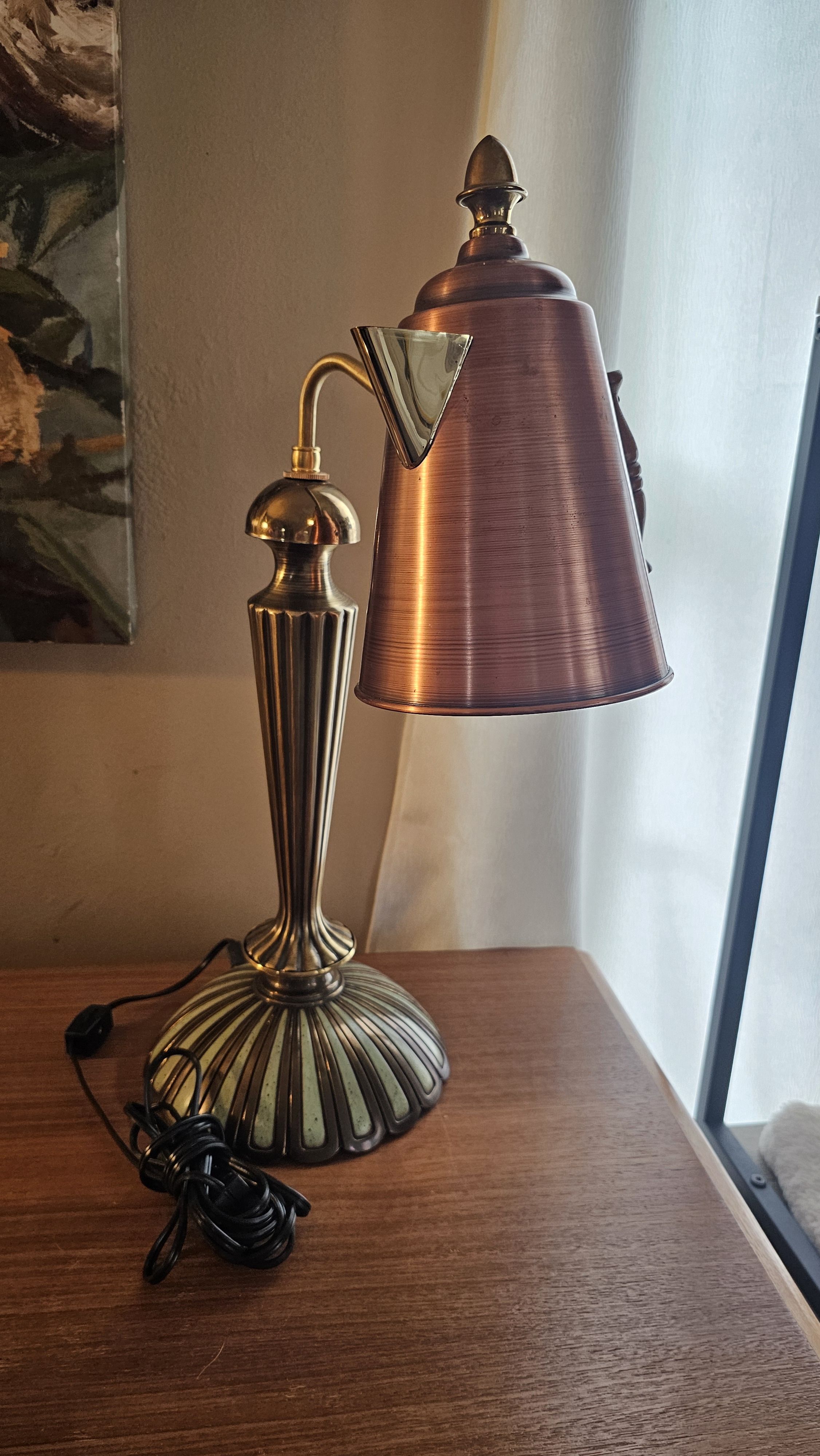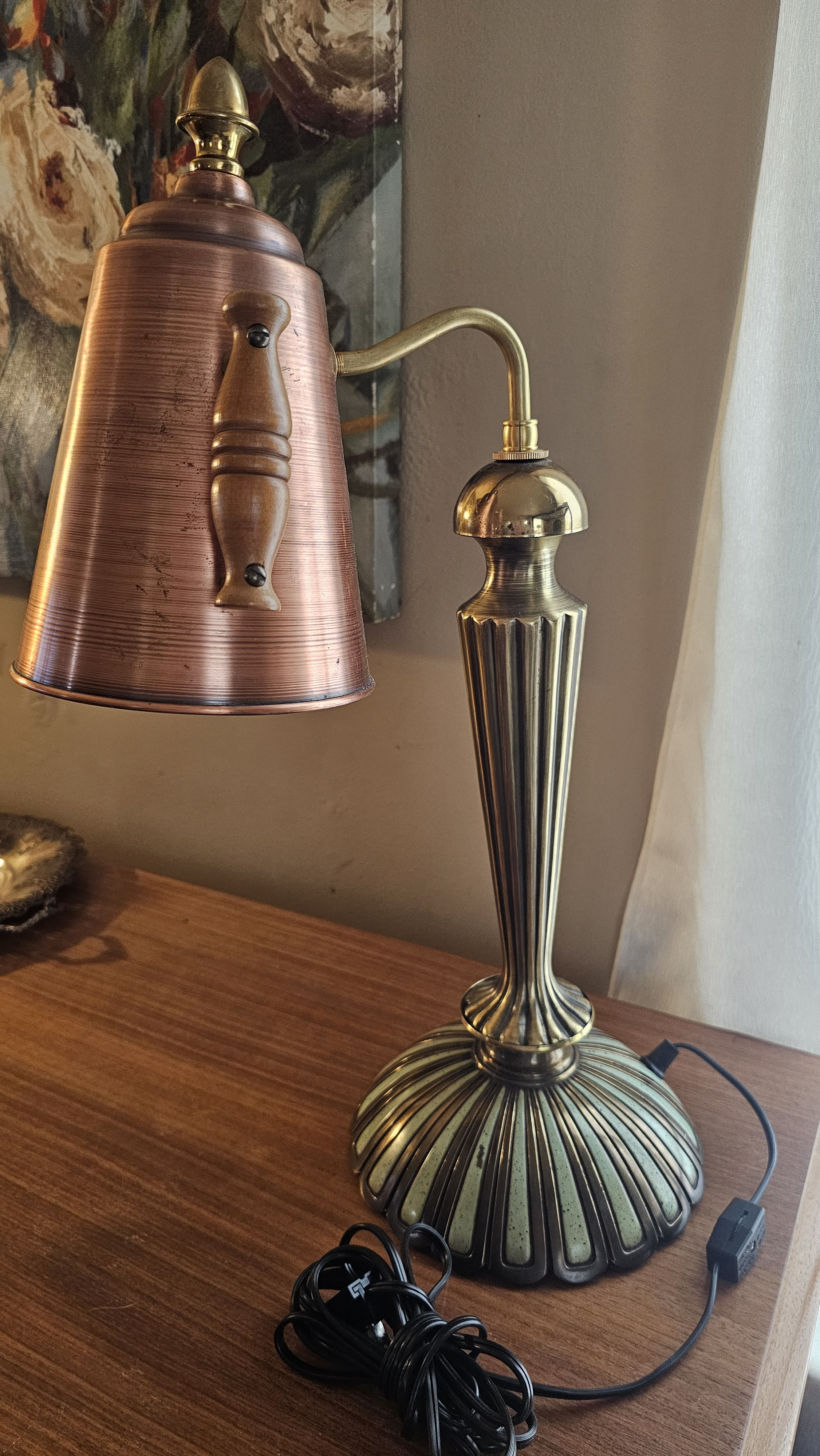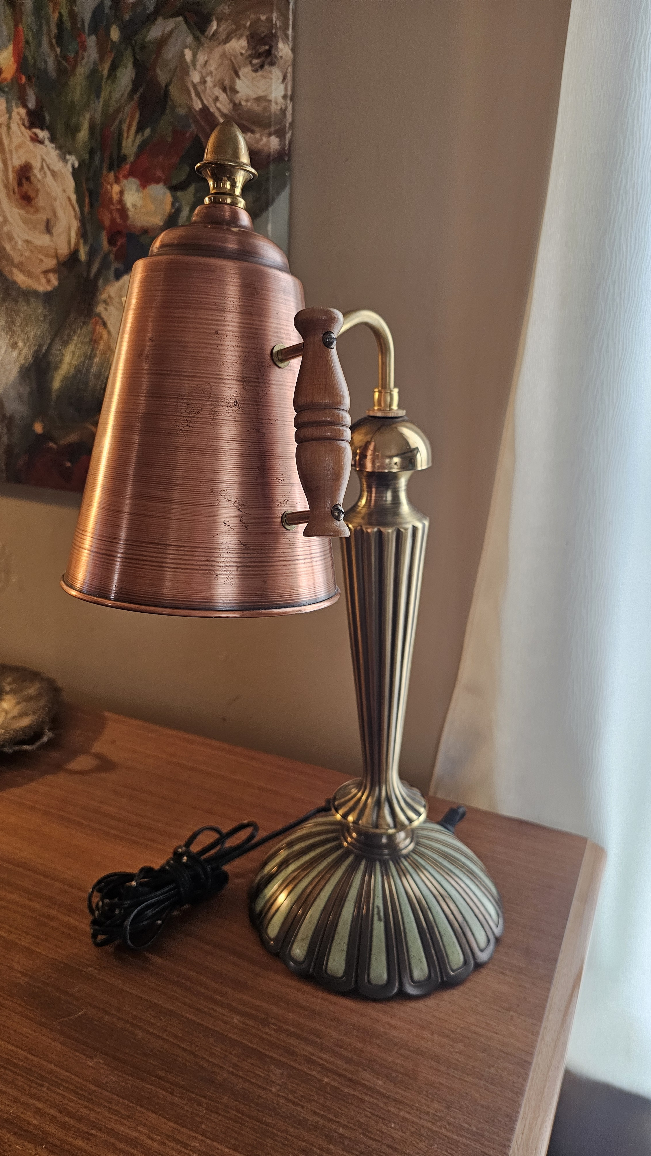 Unique brass lamp with copper kettle lamp shade.