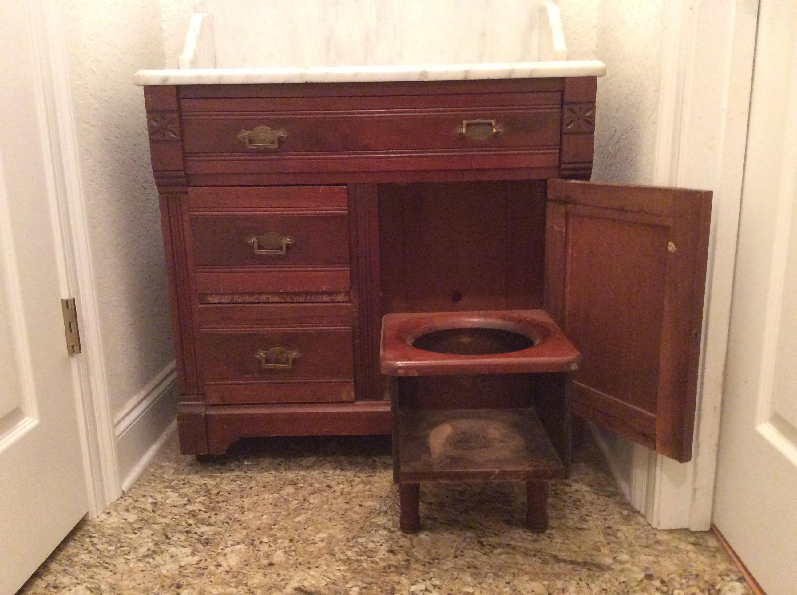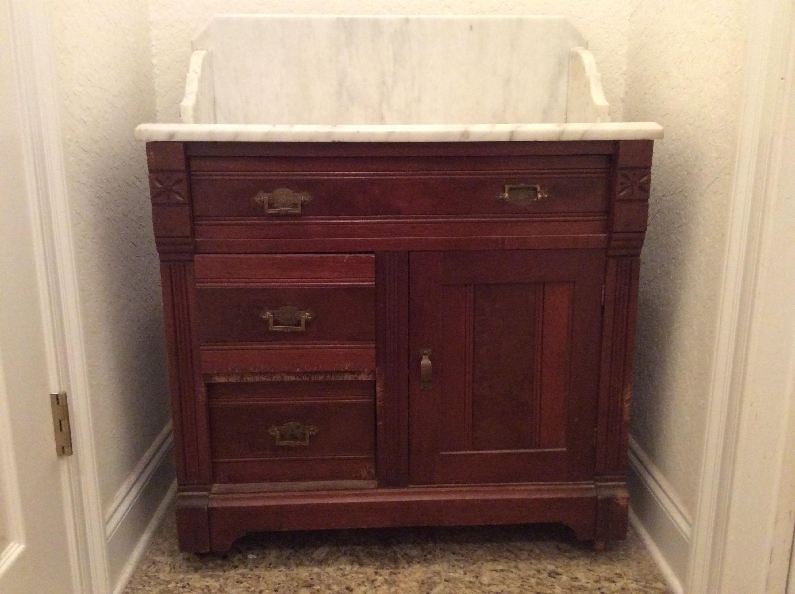 This is a very unique piece.  Was given to my late father in law.  It was from a Captains quarters on an old ship.  We’re still looking for more information. I believe it’s Pine and has a marble top that lifts of separately. It’s als on wheels.  If anyone has any information or ideas please can you let me know. Thanks,Tracy