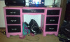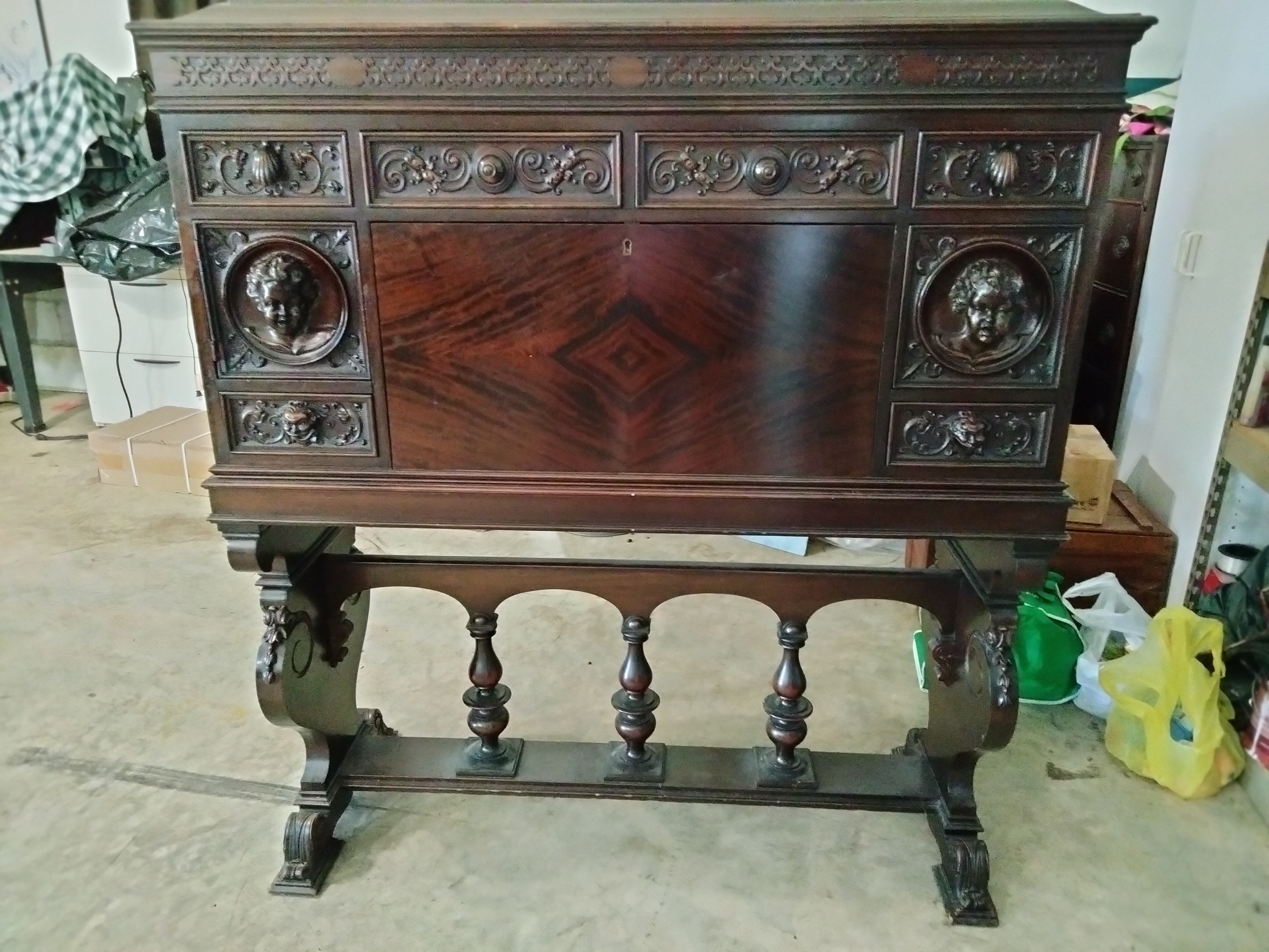 Antique Desk with hand carved Cherub doors with storage. Hand carved drawers. Drop leaf desk with hand carved drawers and letter slots. With chair in excellent condition.