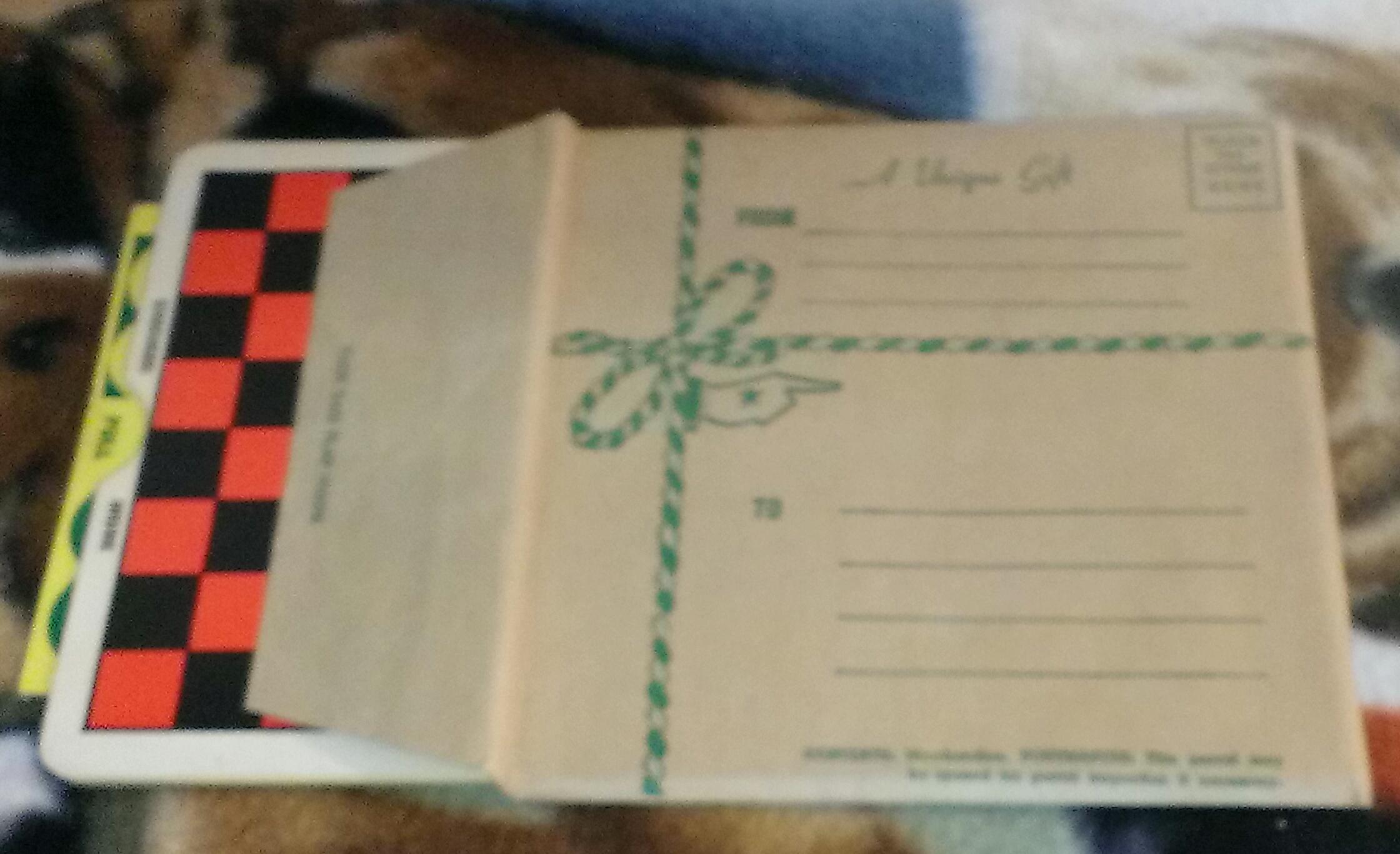 Distinguishing marks On front of package it has a mailing label from and to and place to put stamp with a decorative bow.