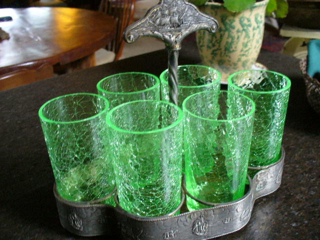 This set belonged to my grandmother and haven't found another s similiar. Any information would be helpful. I can find no markings on glass or carrier
