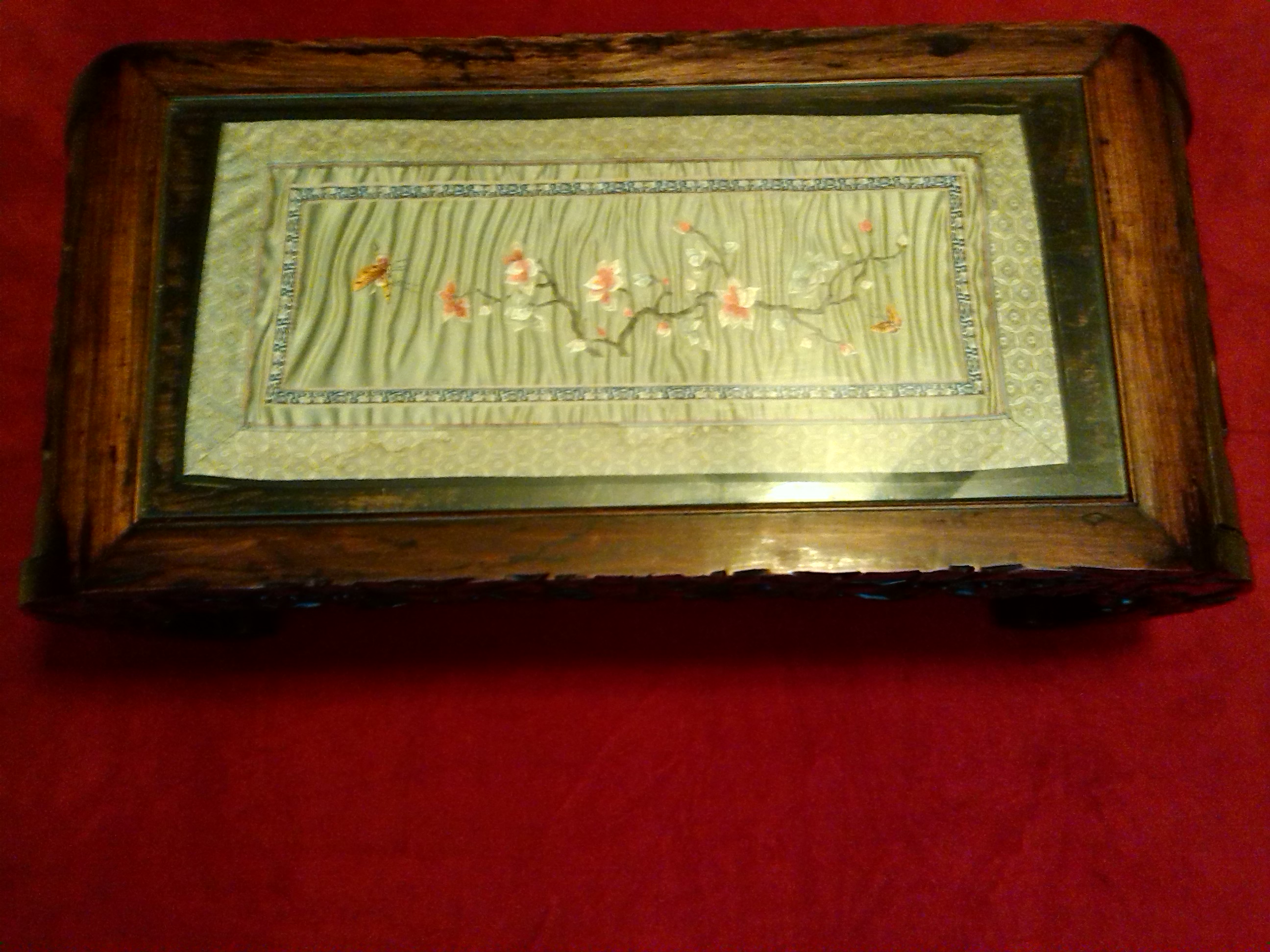 I have been told this was made around 1960 in South Africa using Kiaat Wood, which is a local wild Teak. It stands 16" high and is 43" long and 23" wide. The whole thing is hand carved from wood including the legs and the decrotive table top surround