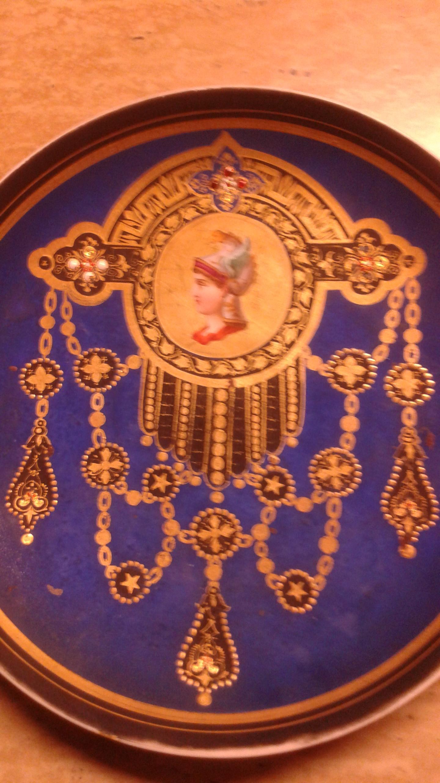 The Plate is Unique the face feels like ivory, the stone looks like pearl, rubies and the chains are made of gold, the potrait is a hermes winged helment with a bird on top. it has a cobolt dull blue finish and it has a etched in mark that looks like a giat V an some that looks like 2 dull looking C.