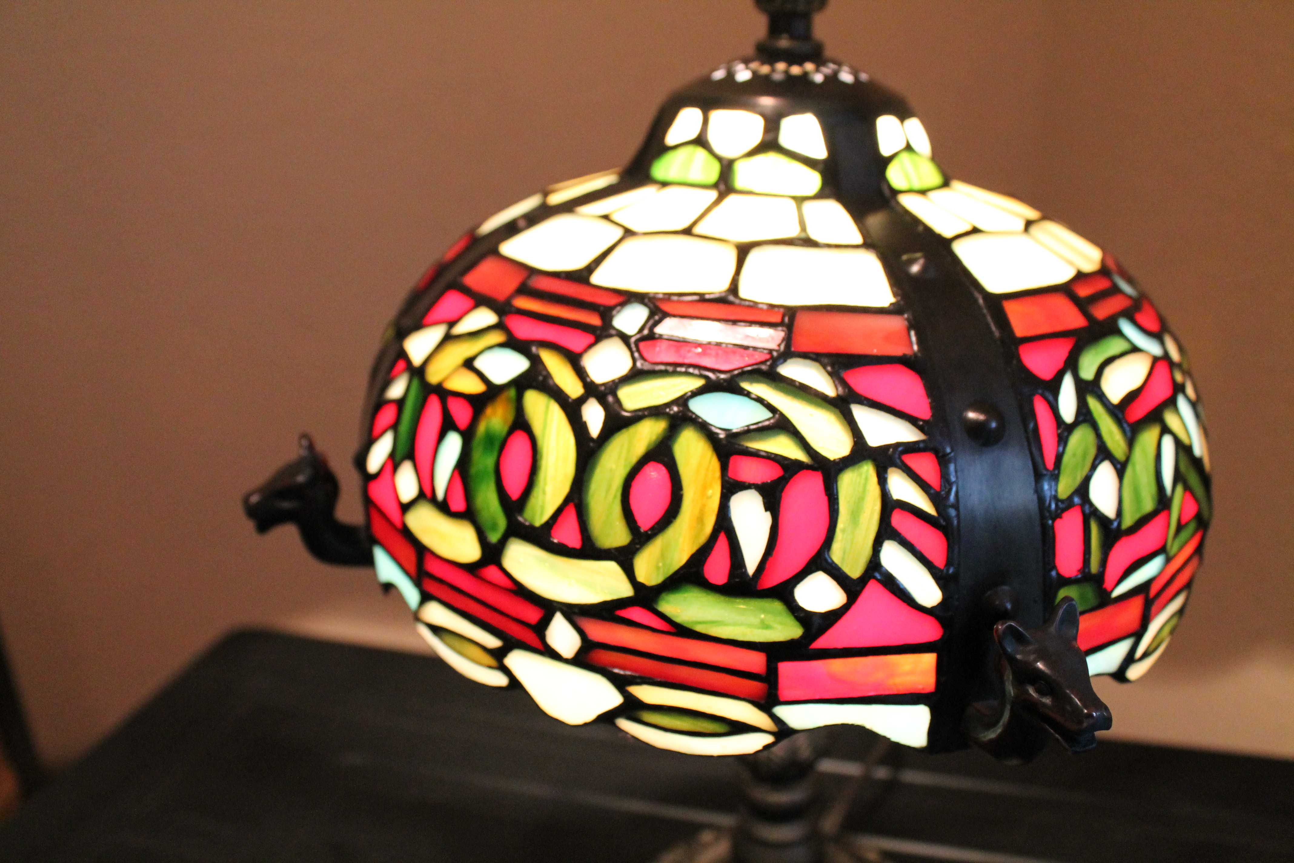 Purchased three reproduction Tiffany lamps from the flea market however this one was very unusual. I can't find anything similar to it online and was wondering if anyone had any information on this piece. Paid $20 for this lamp. The lamp has 4 animal head studs (wolf? dog? llama?) along the edging of the lampshade.