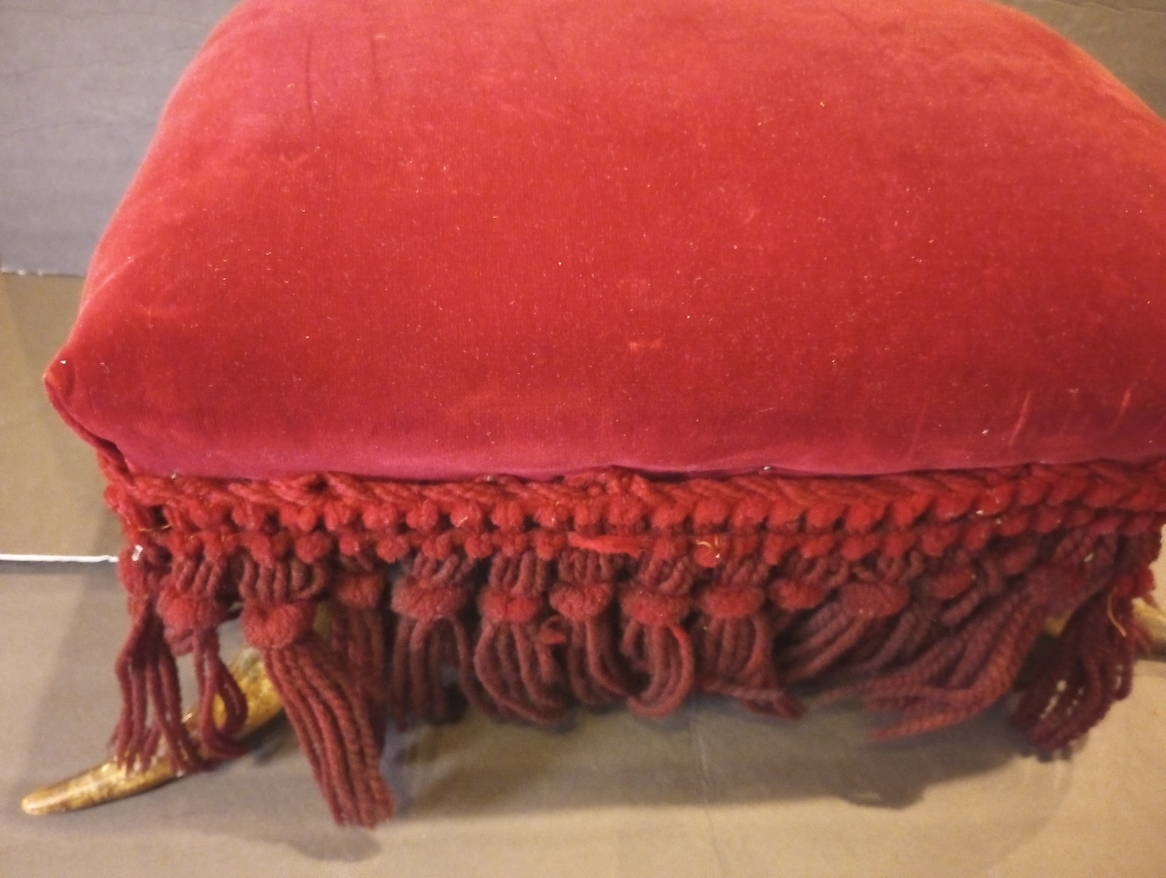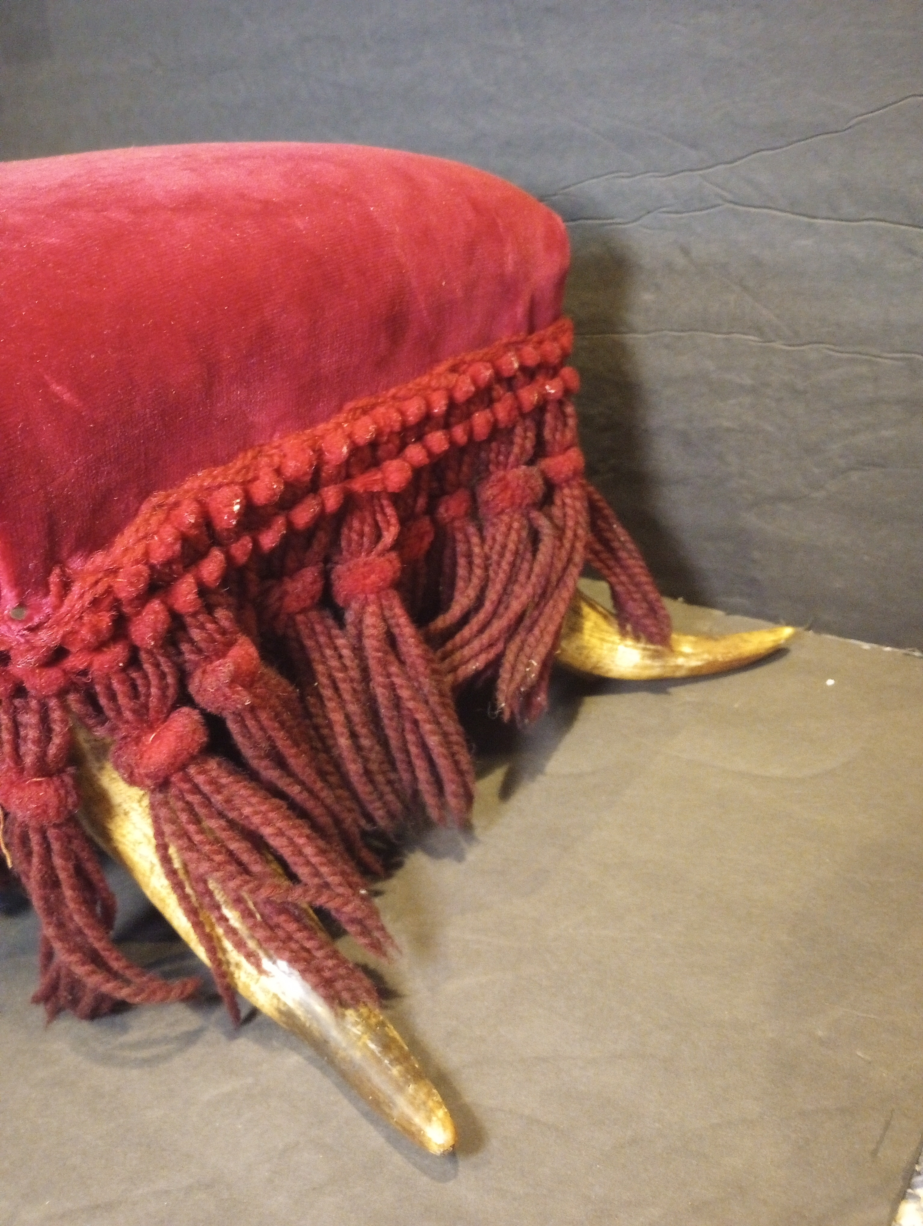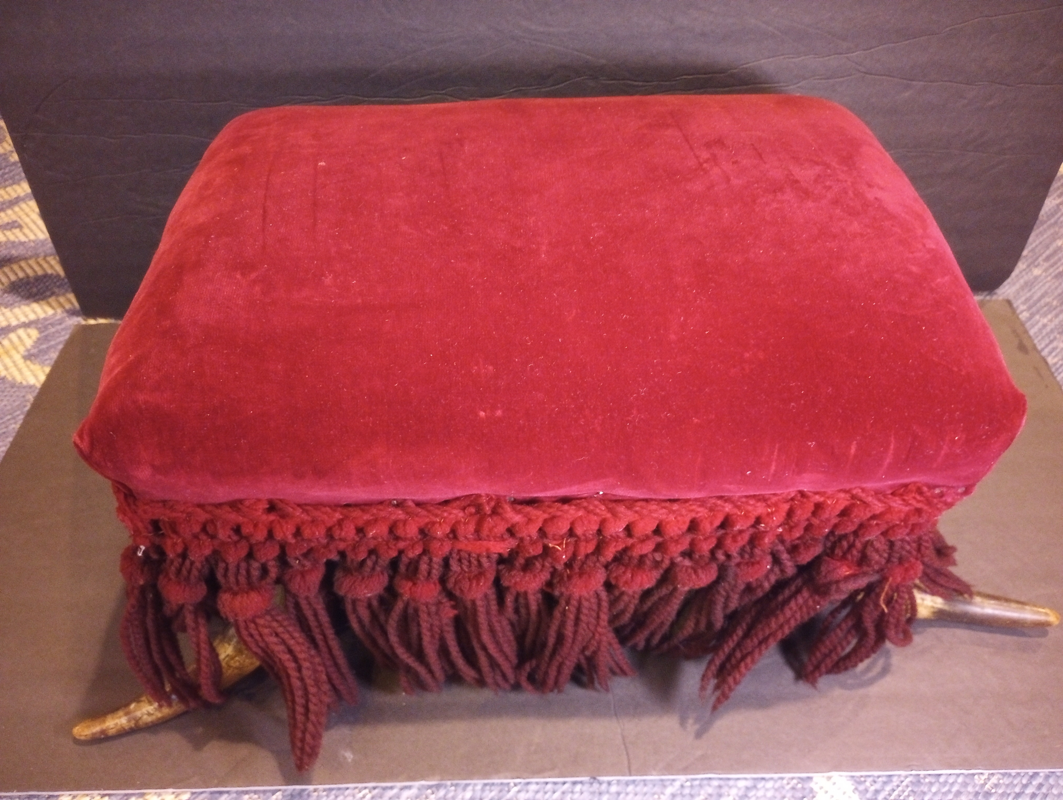 This is a unique and visually striking Victorian-style footstool featuring genuine steer horn legs, rich red velvet upholstery, and elaborate hand-braided fringe. The stool exhibits a classic American West meets Victorian parlor aesthetic, reflecting a blend of rustic and refined sensibilities typical of late 19th to early 20th-century craftsmanship.