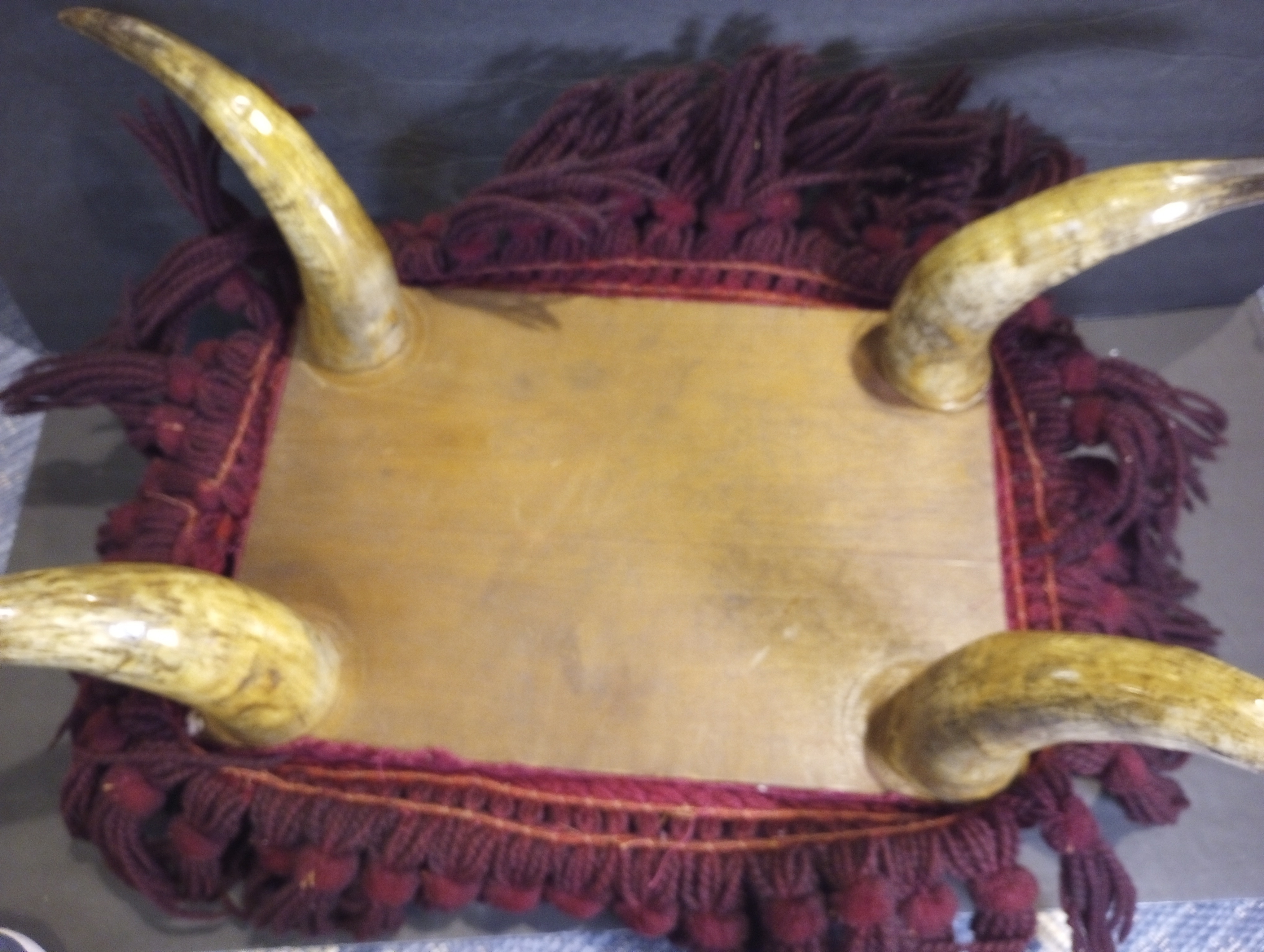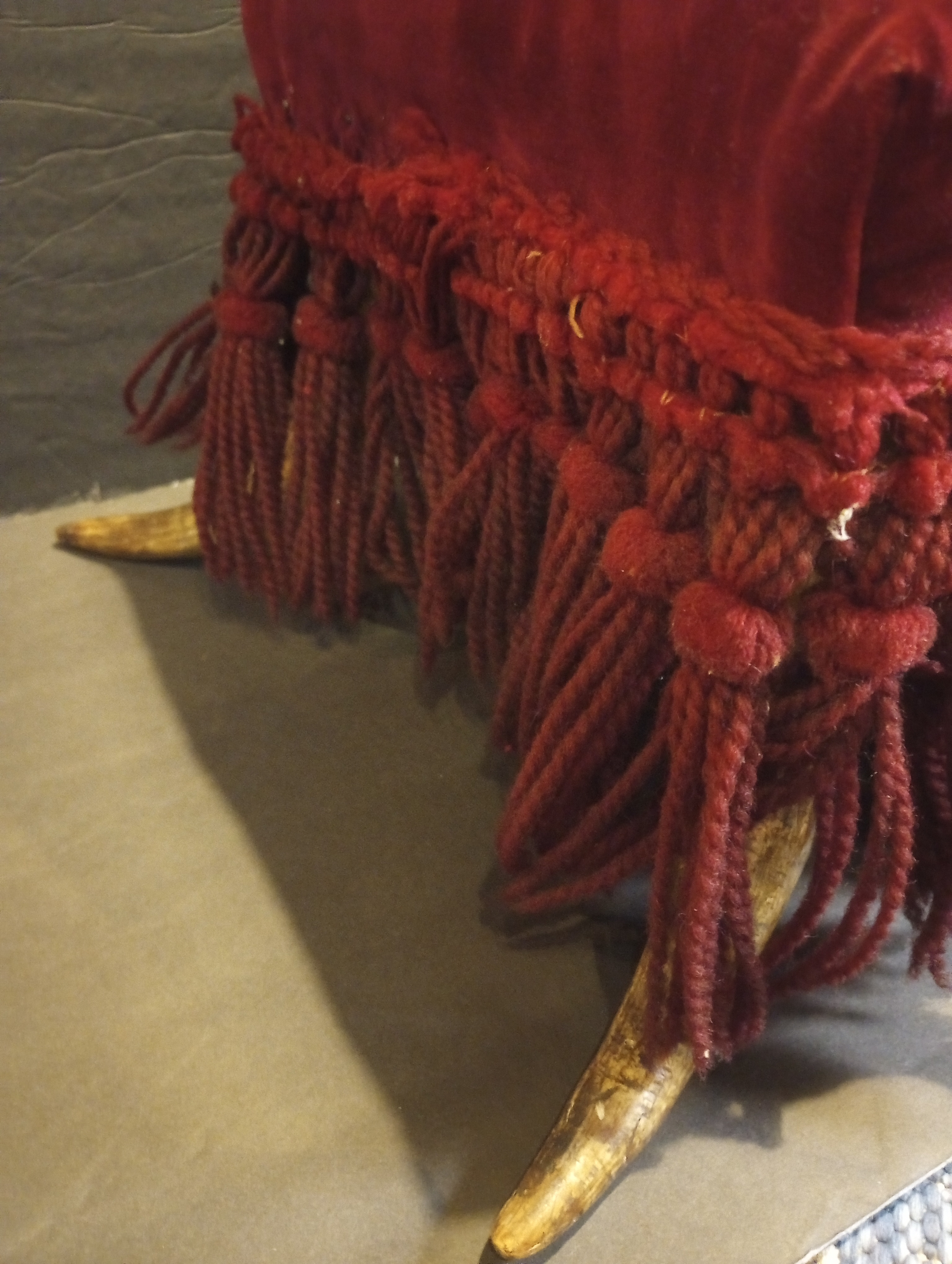 Excellent overall. The velvet remains vibrant, and the horn legs are solid and intact. The only notable wear is some looseness in a section of the fringe, which is easily repairable and common in items of this age.